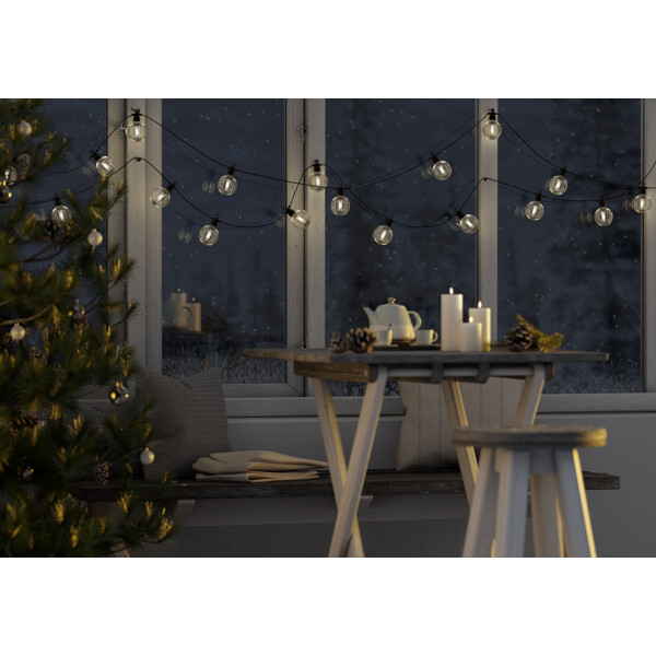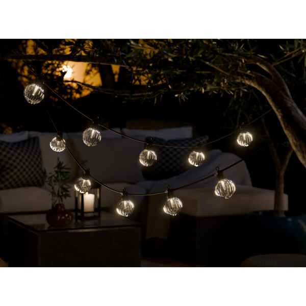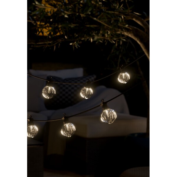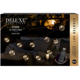 LED-Lichterkette Startset 6 & 8 Meter mit 10 gestreiften Lampen. Die Lichterkette kann sowohl drinnen als auch draußen verwendet werden, da sie wasserdicht ist (IP44).