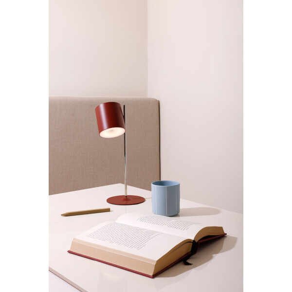 Wiederaufladbare dimmbare Tischlampe mit unendlichen Schirmpositionen für den Innen- und Außenbereich (IP54). Die FLYT-Lampe leuchtet mindestens 8 Stunden hell und 200 Stunden im Stimmungsmodus.