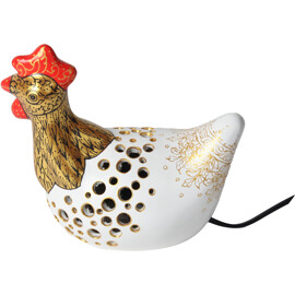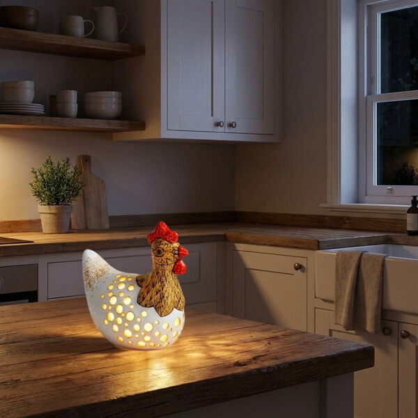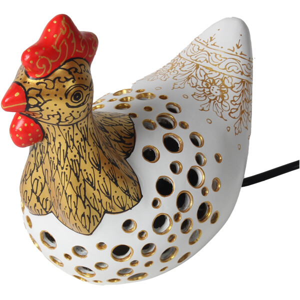 Das einzigartige Element von handgefertigtem Charme und warmem Licht in jedem Raum mit unserer herrlichen Hühnerlampe. Sorgfältig in Thailand aus recycelten Pappröhren hergestellt, ist diese Lampe mit zarten, handbemalten thailändischen Motiven dekoriert, inspiriert von der schönen traditionellen Benjarong-Kunststil. Erhältlich in mehreren Farben. Größe: Circa 11 x 19 x 18 cm. Material: Pappmaché aus recyceltem Papier, fördert nachhaltige Inneneinrichtung. Handbemalt mit komplizierten thailändischen Mustern, was jeder Lampe einen unverwechselbaren künstlerischen Charakter verleiht. Die bezaubernde Hühnerform verleiht Ihrer Küche, Ihrem Wohnzimmer oder Schlafzimmer eine verspielte, aber dennoch elegante Note. Einfach mit einem feuchten Tuch zu reinigen
