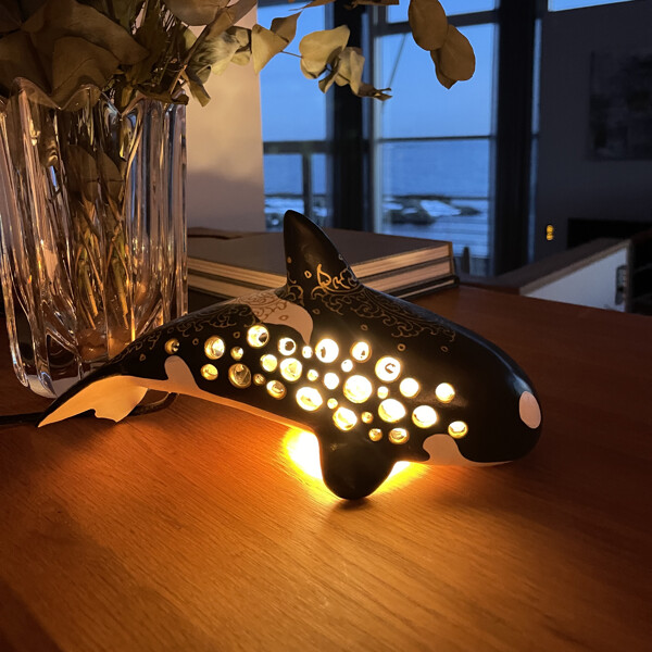 Verleihen Sie Ihrem Zuhause eine maritime Note mit unserer fantastischen handgefertigten Orka-Lampe. Sorgfältig in Thailand aus recycelten Papierkernen hergestellt, weist dieses bemerkenswerte Stück komplizierte, handbemalte thailändische Motive auf, die von der exquisiten traditionellen Benjarong-Kunst inspiriert sind. Entworfen, um ein warmes, umgebendes Licht zu verbreiten, dient diese Lampe nicht nur als wunderschöner dekorativer Mittelpunkt, sondern verleiht Ihrer Umgebung auch einen Hauch von nachhaltiger Eleganz. Größe: Ungefähr 12 x 24 x 13,5 cm. Material: Pappmaché aus recyceltem Papier, fördert nachhaltige Inneneinrichtung. Handbemalt mit detaillierten thailändischen Mustern, was ihr eine einzigartige künstlerische Note verleiht. Die markante Orka-Form vereint kraftvolles Design mit funktionaler Beleuchtung und schafft so einen faszinierenden Blickfang in jedem Raum. Einfach mit einem feuchten Tuch zu reinigen.