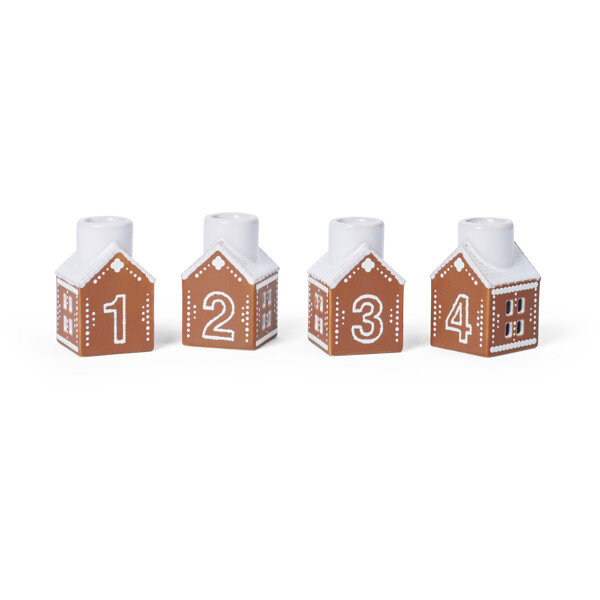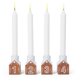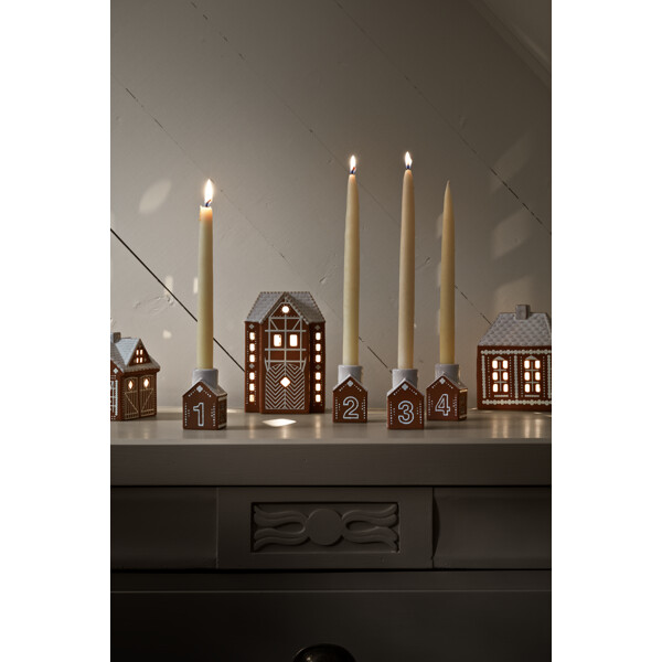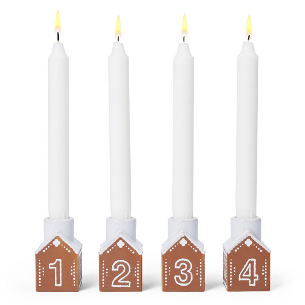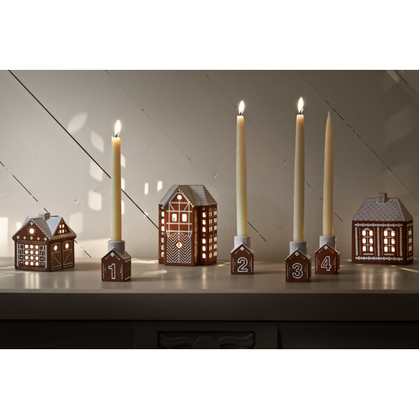 Ein geschmackvoller Weihnachtsklassiker aus handgefertigter Keramik, geformt von Tradition. Kähler Gingerbread ist eine Serie moderner Lebkuchenhäuser und Anhänger von Kähler, bei der eine charmante Ästhetik und handgefertigte Designtraditionen auf die Wärme von Kerzenlicht und klassische Weihnachtstraditionen treffen und sowohl Stil als auch Gemütlichkeit schaffen. Backen gehört zur Weihnachtszeit, und mit ihrem naturgetreuen Ausdruck ist es leicht vorstellbar, dass Kähler gerade ein frisch gebackenes Lebkuchenhaus aus dem Keramikofen genommen hat. Man kann fast den Duft von Lebkuchen riechen, aber lassen Sie sich nicht täuschen – die gesamte Gingerbread-Serie ist aus Steingut gefertigt, und die weiße Glasur ist keramisch. Der Kähler Gingerbread Adventsleuchter misst 7,5 cm in der Höhe und besteht aus vier kleinen Mini-Lichthäusern für Kronenkerzen, die mit ihren komplizierten Mustern und dem Schnee auf dem Dach perfekt die größeren Gingerbread-Lichthäuser ergänzen. Jedes Haus ist als traditioneller Adventsleuchter mit handgezeichneten Zahlen von 1 bis 4 verziert. Und wenn Sie eine Nummerierung als dekoratives Muster bevorzugen, können Sie sie umdrehen und jeden Sonntag im Advent mit den schönsten Schneeflocken illustrieren – genau wie Sie ein Lebkuchenhaus dekorieren würden. Der Gingerbread-Adventsleuchter verleiht dem Zuhause ein nostalgisches und warmes Gefühl und sollte natürlich über Generationen hinweg aufbewahrt und Jahr für Jahr als schöner und gemütlicher Teil der Weihnachtsdekorationen der Familie hervorgeholt werden. Mette Bache und Barbara Bendix Becker sind die Designerinnen hinter Kähler Gingerbread, und ihr Design zeichnet sich durch das Zusammentreffen von Strenge und Authentizität aus. Die geometrischen Oberflächen der Lichthäuser werden durch die verzierten Dekorationen und die vielen Fenster und Türen, die alle – groß und klein – von Hand ausgeschnitten wurden, aufgelockert, was den Lichthäusern einen natürlichen und heimeligen Ausdruck verleiht. Und ebenso ist der Adventsleuchter einfach und grafisch, aber voller Leben und Authentizität durch die Dekorationen und den handgefertigten Ausdruck.