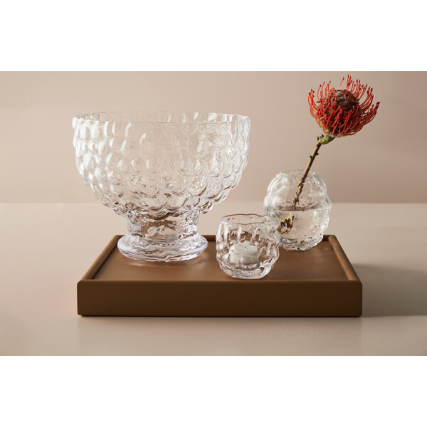 Die Serie Moss von Kosta Boda wurde aus wiederverwendeten alten Formen der Kosta Glasbruk geschaffen, die von Hand geschnitzt wurden, um eine einzigartige, wellenförmige und lebendige Oberfläche im Glas zu erzeugen. Das Windlicht wird nun aus Klarglas hergestellt und verleiht eine Dimension von Leben, bei der das Licht in wellenförmigen Strukturen gebrochen wird. Hergestellt in Kosta mit einem Design von Åsa Jungnelius, wurde es ursprünglich in Zusammenarbeit mit dem 30-jährigen Jubiläum der Göteborger Oper entwickelt.