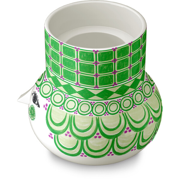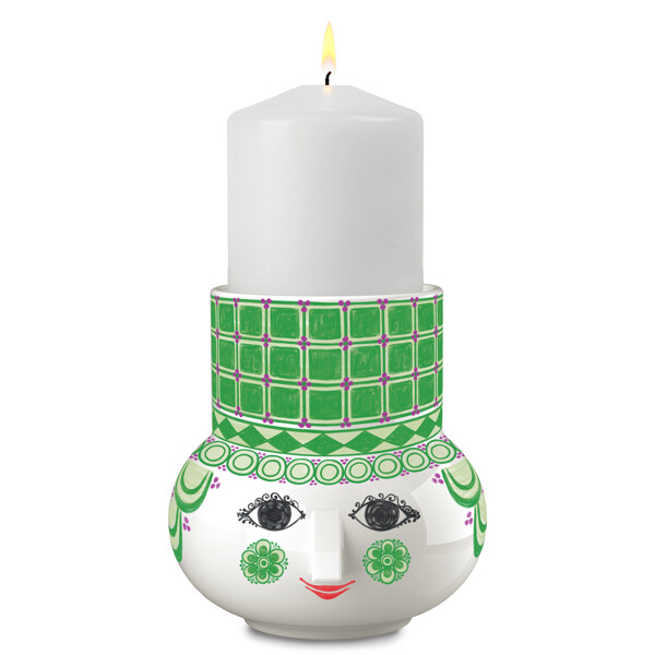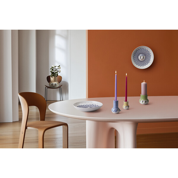 Entfalte deine farbenfrohe Persönlichkeit und schaffe Platz für Freude mit Bjørn Wiinblads Olga. Mit ihrem süßen Lächeln, den farbenfrohen Wangen und den charaktervollen Dekorationen verkörpert Olga das Wesen von Bjørn Wiinblad als Person und Künstler – selbst wenn sie in Form eines Kerzenhalters erscheint. Fröhlich und verträumt bringt sie Leben und Persönlichkeit in die Einrichtung mit ihrem poetischen Ausdruck und ihren lebhaften Farben. Der Olga-Kerzenhalter hat dieselbe runde Form und zylindrische Spitze wie die Vasen der Olga-Serie, die 2024 als Neuinterpretation einer ikonischen Vase aus Bjørn Wiinblads beeindruckendem Designarchiv das Licht der Welt erblickte. Der Kerzenhalter ist mit einem süßen runden Gesicht mit mandelförmigen Augen und der ikonischen dreieckigen Nase verziert – fast die Personifizierung von Bjørn Wiinblads Kunst. Dieser große Kerzenhalter der Serie, der sowohl für Teelichter, Stabkerzen als auch Blockkerzen geeignet ist, ist 12 cm hoch und strahlt in einer klaren hellgrünen Nuance mit lila Punkten. Alle Olga-Kerzenhalter sind aus glasiertem Keramik mit farbenfrohen Dekoren gefertigt, und die Dekorationen sind eine fantastische Mischung aus Originalmustern von Bjørn Wiinblad, präsentiert in einer vielfältigen Farbpalette, die einen modernen und frischen Ausdruck verleiht. Bjørn Wiinblad war ein lebensfroher Künstler mit einer großen und farbenfrohen Persönlichkeit, der seinen eigenen Weg ging und keine Angst hatte, groß zu träumen. Diese Seele lebt in Olga weiter, die Selbstvertrauen ausstrahlt und uns inspiriert, unseren eigenen Stil und unsere Persönlichkeit durch Dekorationen auszudrücken, die von Bjørn Wiinblads Originalkunstwerken inspiriert sind. Eines ist sicher: Es wird nie langweilig, wenn Olga einzieht.