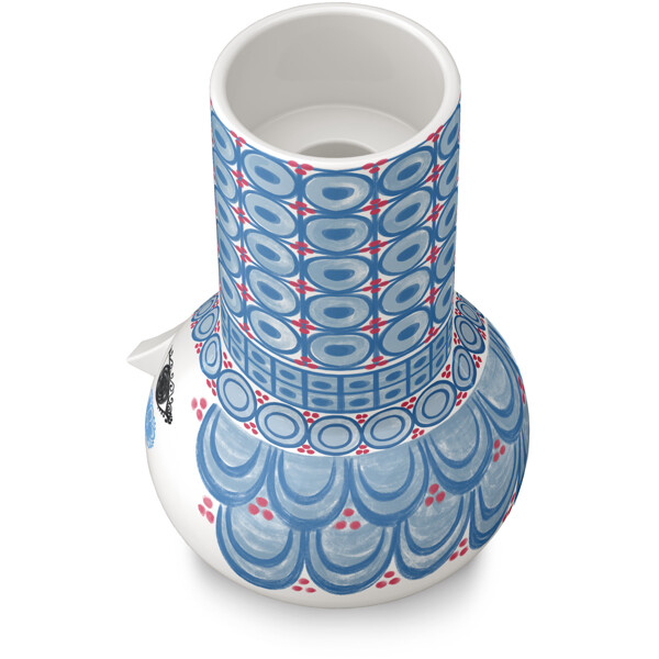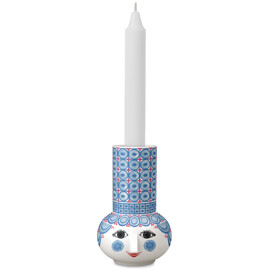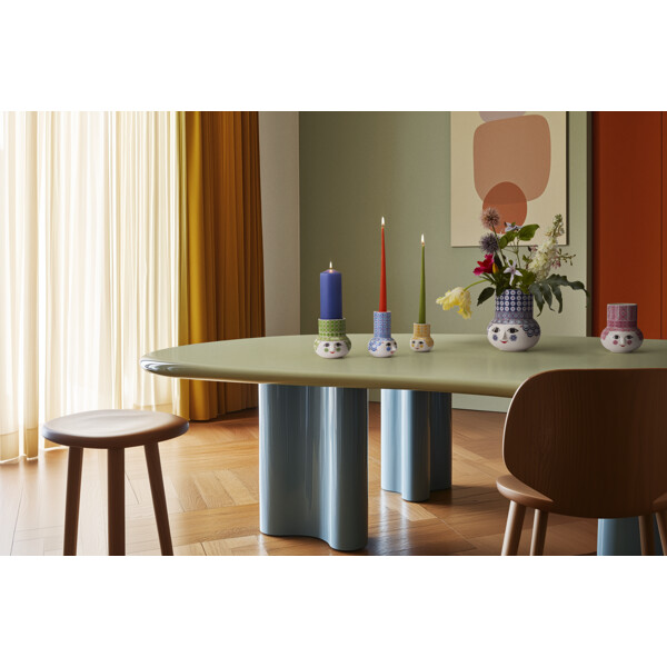 Entfalte deine farbenfrohe Persönlichkeit und schaffe Platz für Freude mit Bjørn Wiinblads Olga. Mit ihrem süßen Lächeln, den farbenfrohen Wangen und den charaktervollen Verzierungen verkörpert Olga das Wesen von Bjørn Wiinblad als Person und Künstler – selbst wenn sie in Form eines Kerzenhalters erscheint. Fröhlich und verträumt bringt sie Leben und Persönlichkeit in die Einrichtung mit ihrem poetischen Ausdruck und ihren lebhaften Farben. Der Olga-Kerzenhalter hat dieselbe runde Form und zylindrische Spitze wie die Vasen der Olga-Serie, die 2024 als Neuinterpretation einer ikonischen Vase aus Bjørn Wiinblads beeindruckendem Designarchiv das Licht der Welt erblickte. Der Kerzenhalter ist mit einem süßen runden Gesicht mit mandelförmigen Augen und der ikonischen dreieckigen Nase verziert – fast die Personifizierung von Bjørn Wiinblads Kunst. Dieser große Kerzenhalter der Serie, der sowohl für Teelichter als auch für Stabkerzen geeignet ist, ist 14 cm hoch und strahlt in einer klaren hellblauen Nuance mit noch helleren blauen Tönen und hellrosa Punkten. Alle Olga-Kerzenhalter sind aus glanzglasierter Keramik mit farbenfrohen Dekoren gefertigt, und die Verzierungen sind eine fantastische Mischung aus Originalmustern von Bjørn Wiinblad, präsentiert in einer vielfältigen Farbpalette, die einen modernen und frischen Ausdruck verleiht. Bjørn Wiinblad war ein lebensfroher Künstler mit einer großen und farbenfrohen Persönlichkeit, der seinen eigenen Weg ging und keine Angst hatte, groß zu träumen. Diese Seele lebt in Olga weiter, die Selbstvertrauen ausstrahlt und uns inspiriert, unseren eigenen Stil und unsere Persönlichkeit durch Dekorationen auszudrücken, die von Bjørn Wiinblads Originalkunstwerken inspiriert sind. Eines ist sicher: Es wird nie langweilig, wenn Olga einzieht.