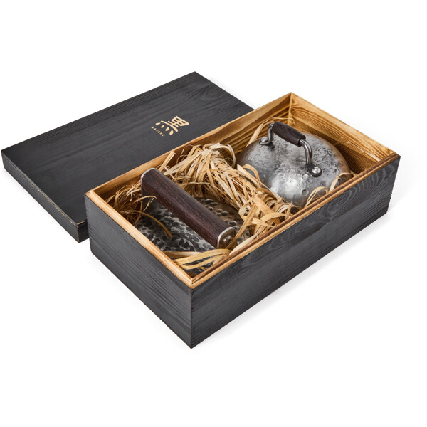 Handgeschmiedeter Stahl mit Attitüde und einem unglaublich schicken Design, geliefert in eleganten schwarzen Holzkisten. Alle Produkte der Serie werden in derselben Fabrik hergestellt, die auch die Messer der Kuro-Serie produziert.