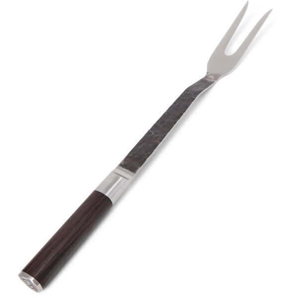 Diese Grillgabel ist aus handgeschmiedetem Stahl mit einem dunklen Holzgriff gefertigt, der Qualität und Handwerkskunst ausstrahlt.