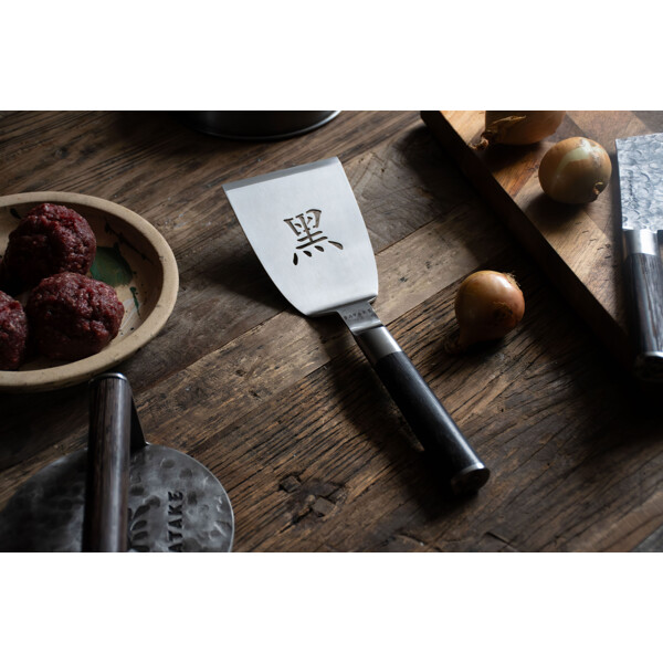 Breiter und robuster Pfannenwender aus handgeschmiedetem Stahl mit Holzgriff und ausgestanztem Logo im Blatt. Das Logo ist das japanische Zeichen für Kuro, was "schwarz" bedeutet und auf den rauen handgeschmiedeten Stahl der Serie verweist.