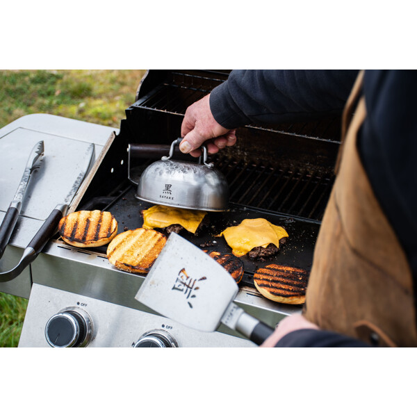 Um einen perfekten Smash-Burger zuzubereiten - smashen und braten Sie eine Seite des Burgers kräftig an. Wenden Sie dann den Burger mit diesem hervorragenden Pfannenwender, legen Sie einen richtig guten Käse darauf und stellen Sie die Cloche darüber, um den Käse perfekt zu schmelzen.