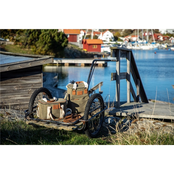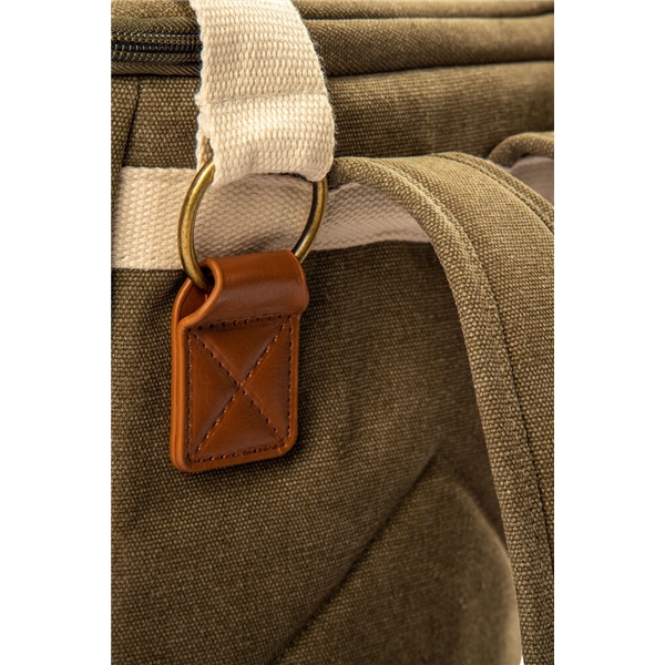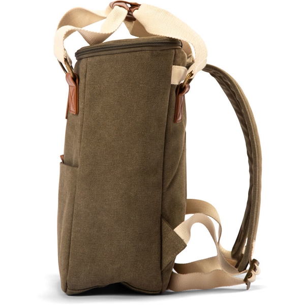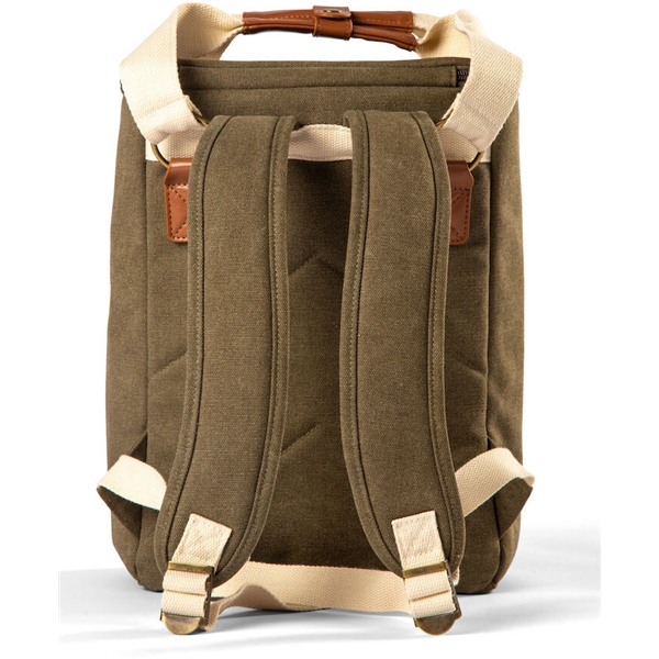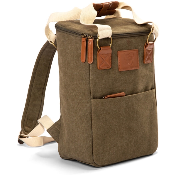 Schicker Rucksack-Kühlbeutel aus robustem Canvas, großes Hauptfach und drei kleinere Taschen für Zubehör. Der Rucksack hat verstellbare Gurte und hält das Picknick den ganzen Tag gut gekühlt. Details aus PU-Leder.