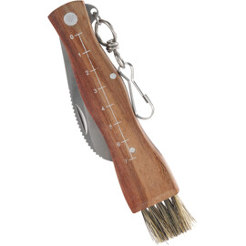 Praktisches Pilzmesser mit klappbarer Klinge, Bürste zur Reinigung und Maßskala am Holzgriff. Perfekt zum Pilzesammeln im Wald. Ein praktischer Karabinerhaken ermöglicht es, das Messer einfach am Gürtel oder Rucksack zu befestigen. Ein Muss für alle Pilzliebhaber.