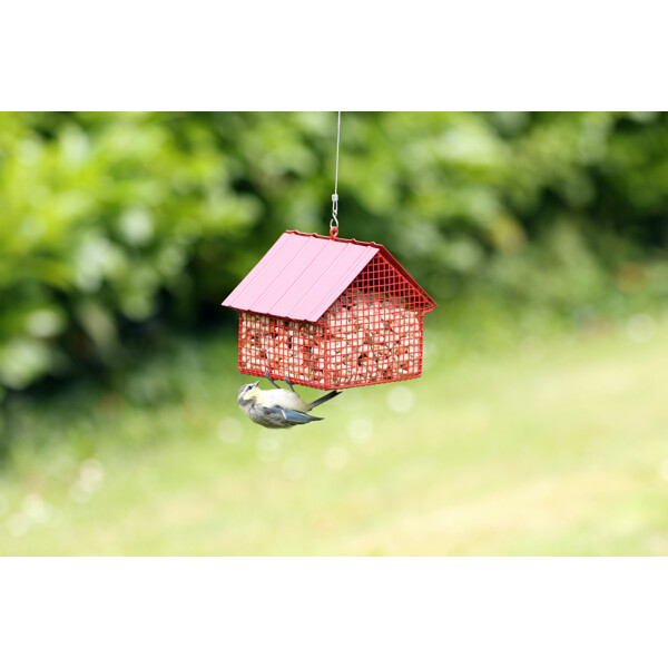 Dieser hängende Vogelfutterspender in Form eines kleinen Häuschens ist clever konstruiert. Er ist für Erdnüsse gemacht, die in ein Metallnetz gelegt werden, was das Risiko minimiert, dass Kot mit dem Futter in Kontakt kommt. Er ist so gestaltet, dass kleine Vögel leicht darauf sitzen und von verschiedenen Seiten fressen können, aber er eignet sich nicht für größere Vögel. Meisen, wie zum Beispiel Blaumeisen, sind besonders erpicht auf Erdnüsse.