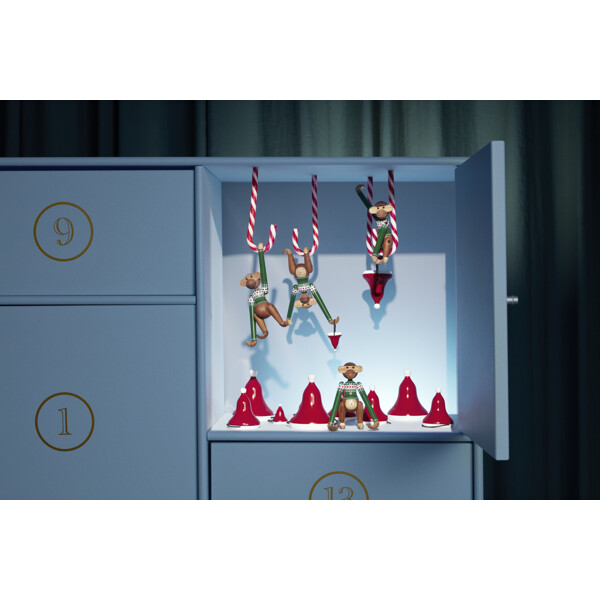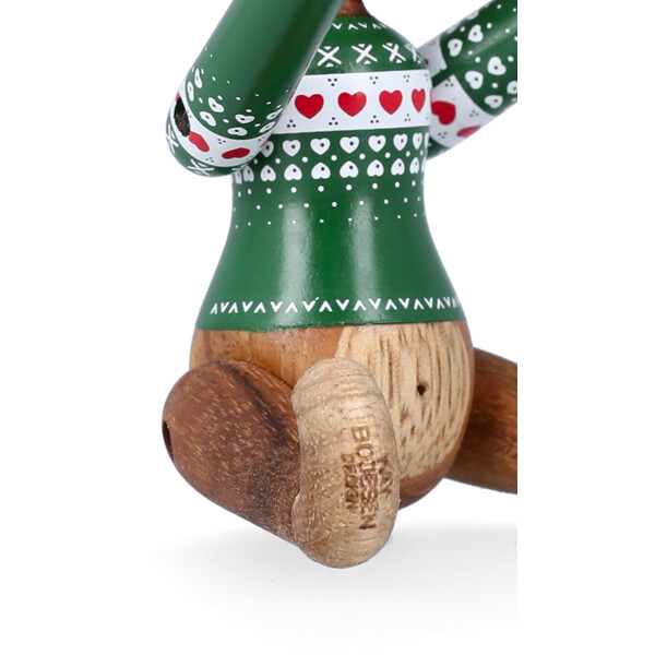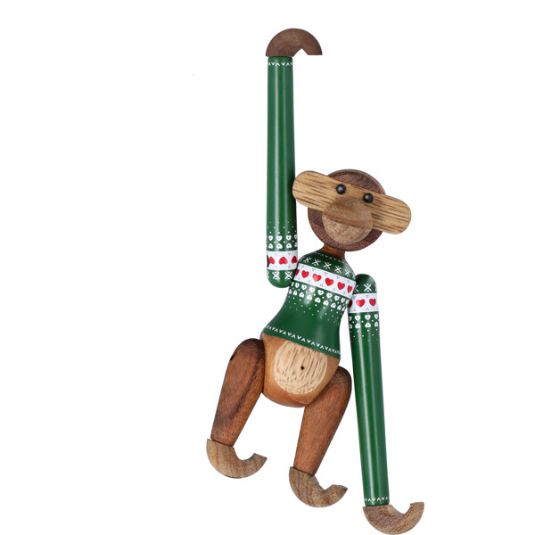 Originale Weihnachtsmagie mit einem stilvollen und modernen Touch. Mit dem immer lächelnden Kay Bojesen-Affen in einer einzigartigen Weihnachtsausgabe, gekleidet in einen schönen grünen Weihnachtspullover, wird die Geschichte von Kay Bojesens weltberühmter Designikone noch enger mit unseren gemütlichen Weihnachtstraditionen verwoben. Der Kay Bojesen Affe Weihnachtspullover 2025 ist aus der bekannten, schön geölten Kombination von FSC®-zertifiziertem Teakholz und kontrolliertem Limba gefertigt und ist sowohl in dieser Mini-Ausgabe von 9,5 cm als auch in der klassischen kleinen Größe von 18,5 cm Höhe erhältlich. Beide sind mit einem klassischen Weihnachtsmuster mit feinen roten und weißen Weihnachtsherzen auf Brust, Bauch und Schultern verziert – sowie einem charmanten kleinen Detail in Form eines schmalen Bandes mit einem dekorativen Zickzackmuster an jedem Ärmelende und entlang des Saums. Die grüne Grundfarbe des Pullovers ist sorgfältig von Hand bemalt, während das Muster in Weiß und Rot mit präziser Drucktechnik aufgebracht wird, um jedes kleine Detail einzufangen und dem Weihnachtspullover einen authentischen und durchdachten Ausdruck zu verleihen. Er ist voller der Seele und des Humors, die schon immer der Kern von Kay Bojesens einzigartigem Handwerk und Erzählkunst waren. Die klassischen Weihnachtsfarben und das ikonische Weihnachtsmuster machen den Affen zu einem selbstverständlichen und verspielten Element in einer modernen Weihnachtsdekoration, wo er sowohl Charme als auch Stil mit seinem pfiffigen Ausdruck und farbenfrohen Aussehen hinzufügt – egal, wo er platziert wird. Der Kay Bojesen Affe Weihnachtspullover 2025 ist nostalgisches und innovatives dänisches Design, das dem ikonischen Design-Erbe von Kay Bojesen demütig und mit einem Augenzwinkern ein neues, herzerwärmendes Kapitel voller Weihnachtsfreude hinzufügt, das seine Originalgeschichten in Holz seit 1922 fortsetzt.