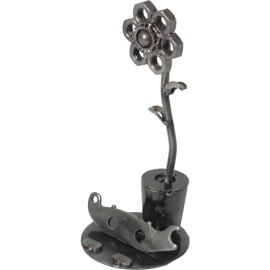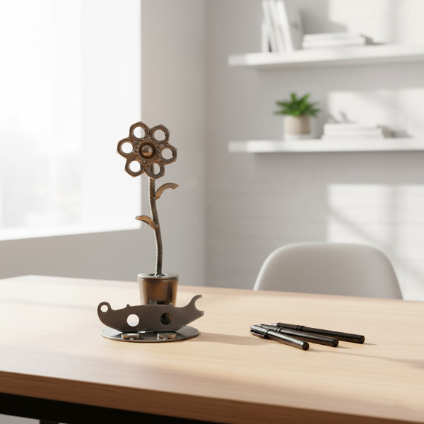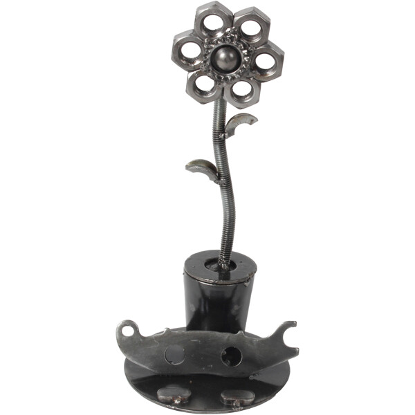 Aktualisieren Sie Ihren Arbeitsplatz mit unserer charmanten Blumenskulptur, einem zu 100 % handgefertigten Werk aus recyceltem Metall, hergestellt von geschickten Handwerkern. Jedes Blütenblatt und jeder Stängel spiegelt eine einzigartige Geschichte der Verwandlung wider und symbolisiert Wachstum und kreatives Design. Perfekt für Schreibtische oder Regale. Die geniale Basis dient als Halter für Telefone, Visitenkarten oder Notizen. Sie hat eine rustikale, aber dennoch moderne Ästhetik aus wiederverwendetem Material. Maße: Ungefähr 15 x 10 x 25 cm. Umweltfreundlich. 100 % Handgefertigt. Recyceltes Metall.