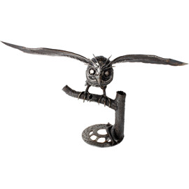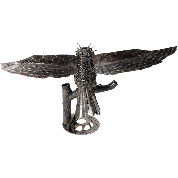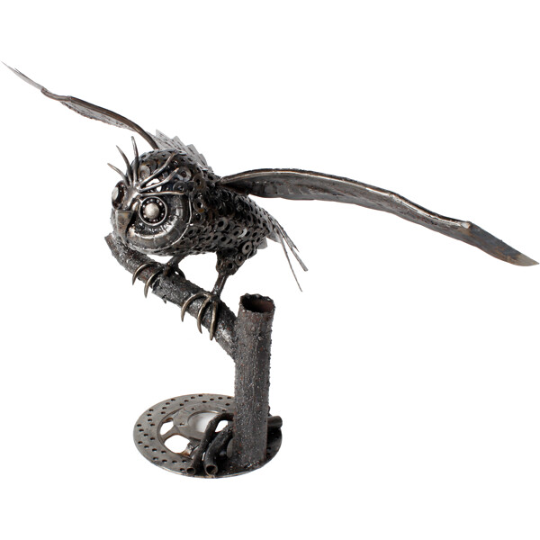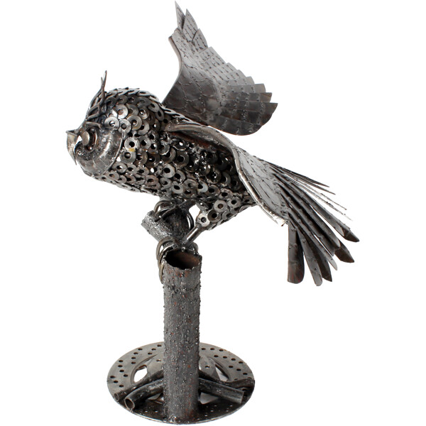 Unsere geschickten Handwerker haben recycelte Materialien umgewandelt – beachten Sie die faszinierende Verwendung verschiedener Metallkomponenten für den gefiederten Körper und die ausgebreiteten Flügel – in ein kraftvolles Detail einer majestätischen Eule im Flug. Auf einem robusten, industriell inspirierten Ständer stehend, ist jedes Element durchdacht integriert und schafft eine wirklich einzigartige Skulptur, die die Eleganz und Stärke dieses nächtlichen Jägers einfängt und robuste Industrieästhetik mit der majestätischen Schönheit der Natur verbindet.