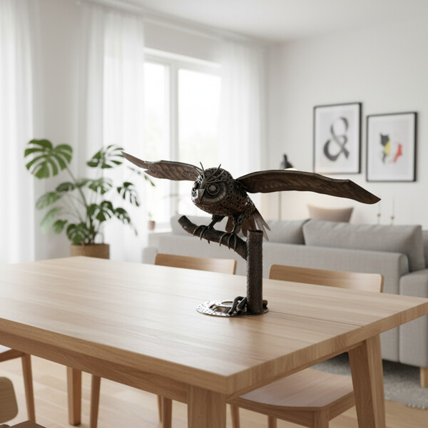 Erhöhen Sie Ihre Dekoration mit der fesselnden Präsenz dieser unglaublichen, zu 100 % handgefertigten Metallskulptur einer fliegenden Eule! Dies ist nicht nur eine dynamische Dekoration; es ist ein echtes Kunstwerk, sorgfältig aus recyceltem Metall gefertigt, was es zu einer nachhaltigen und absolut faszinierenden Ergänzung für jedes Zuhause, Büro oder jeden Raum macht.