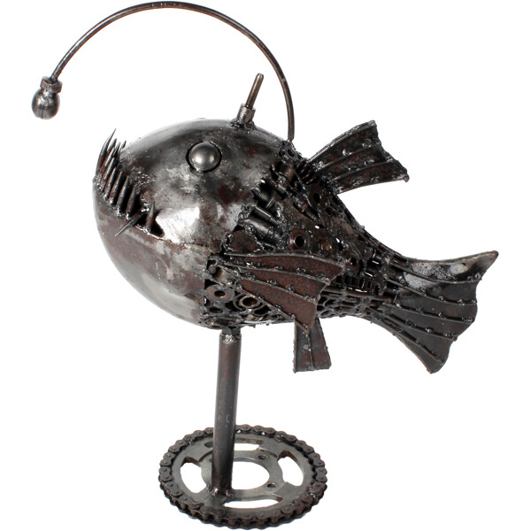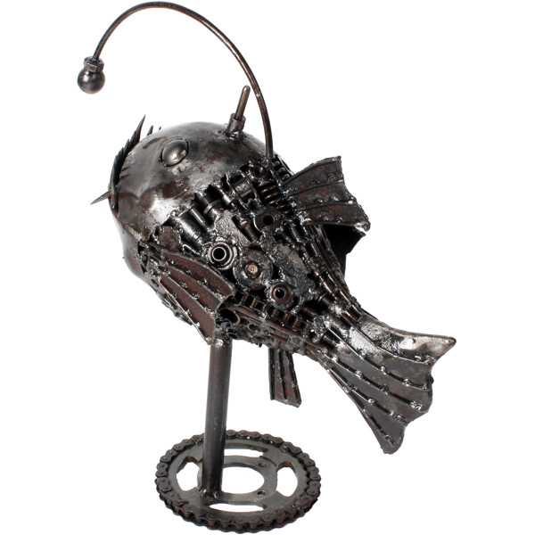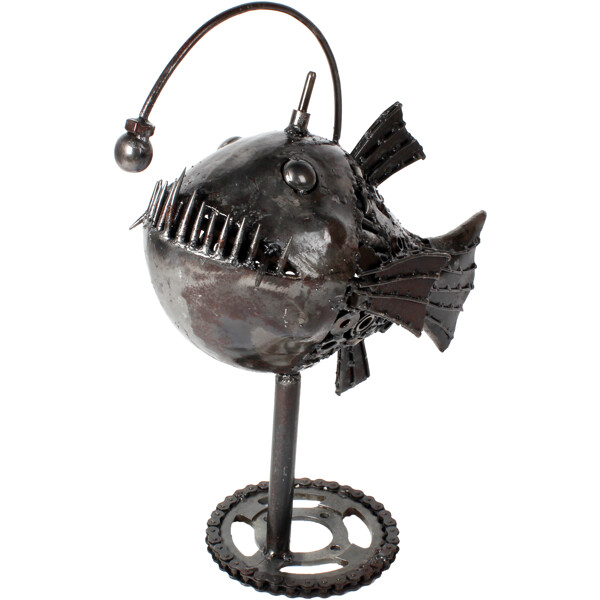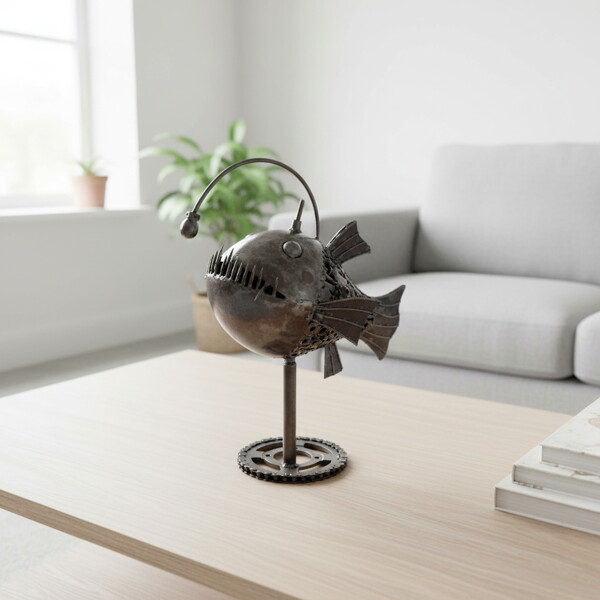 Erhöhen Sie Ihre Einrichtung mit dieser unglaublichen, zu 100 % handgefertigten Glimmerbite Angler Fish-Metallskulptur! Dies ist nicht nur ein faszinierendes Detail; es ist ein echtes Kunstwerk, sorgfältig aus recyceltem Metall gefertigt, was es zu einer nachhaltigen und absolut faszinierenden Ergänzung für jedes Zuhause, Büro oder kreative Umfeld macht. Unsere geschickten Handwerker haben recyceltes Material in eine fesselnde und fantasievolle Darstellung des Tiefseefisches Angler Fish verwandelt, komplett mit seinem ikonischen leuchtenden Köder. Jeder Stachel, jeder Zahn und sein charakteristisches Licht sind geformt, was eine wirklich einzigartige Skulptur schafft, die industrielles Design mit mystischem Unterwasser-Charme verbindet. Die robuste, von Zahnrädern inspirierte Basis garantiert Stabilität und trägt zu ihrem einzigartigen Charakter bei. Maße: Ca. 25 x 30 x 30 cm Umweltfreundlich 100 % Handgefertigt Recyceltes Metall