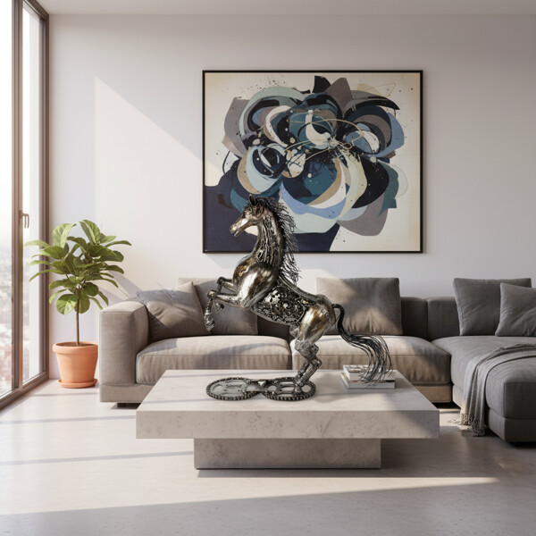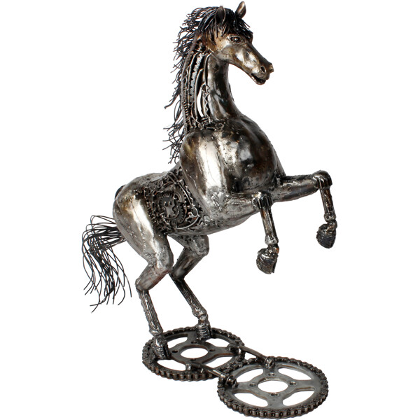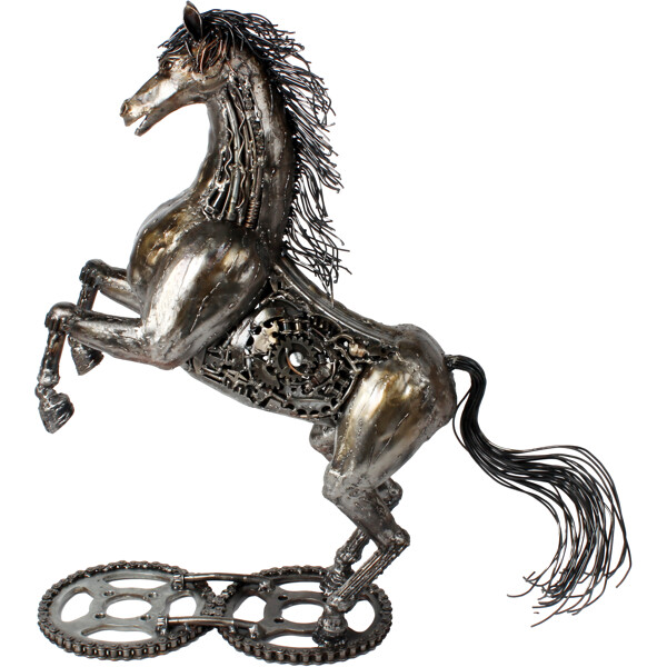 Diese beeindruckende Skulptur fängt die dynamische Eleganz eines Pferdes ein und wird zum kraftvollen Mittelpunkt in jedem Raum. Die rohe Schönheit des Metalls, kombiniert mit der detaillierten Kunstfertigkeit, garantiert, dass keine zwei Werke genau gleich sind. Bringen Sie ein Werk nach Hause, das eine Geschichte von Kreativität, Können und Umweltbewusstsein erzählt. Ein perfekter Gesprächsanlass und ein einzigartiges Geschenk für Kunstliebhaber!