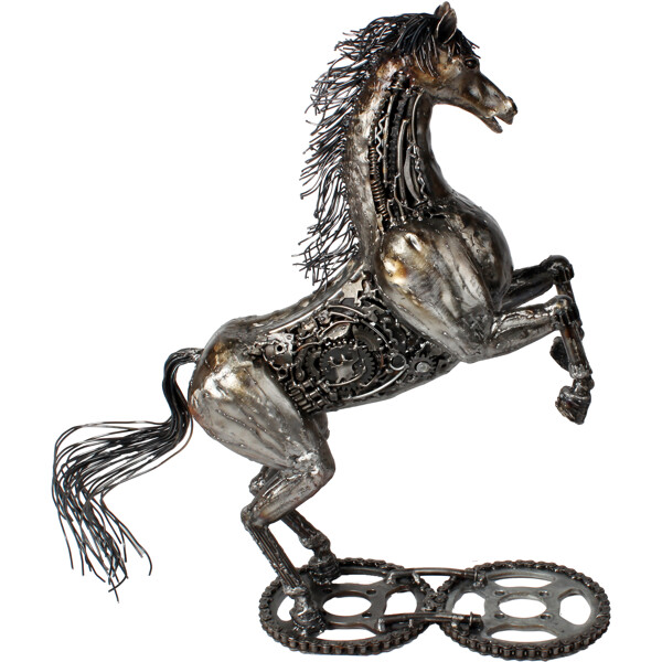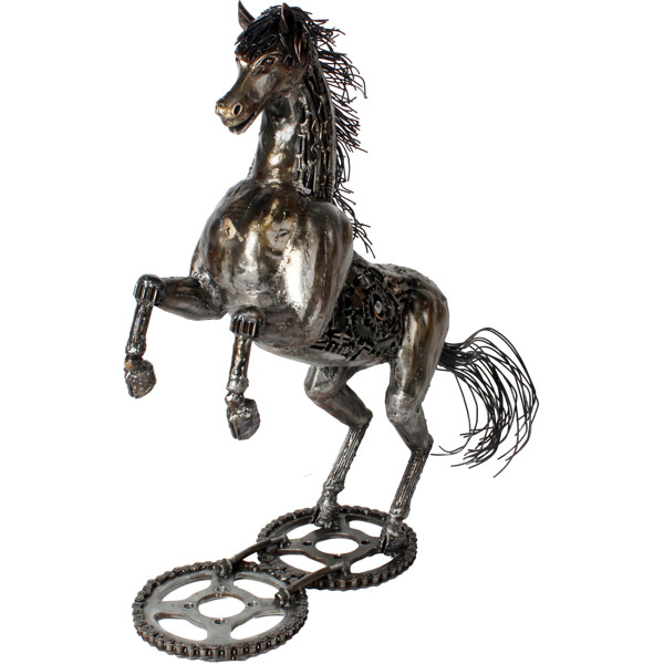 Erhöhen Sie Ihre Umgebung mit dieser fantastischen, 100% handgefertigten Pferdeskulptur, einem wahren Zeugnis künstlerischen Könnens und nachhaltigen Designs. Jedes Detail dieses großartigen Werks ist sorgfältig aus recyceltem Metall gefertigt, das weggeworfenen Materialien neues Leben einhaucht und sie in ein einzigartiges Kunstwerk verwandelt.