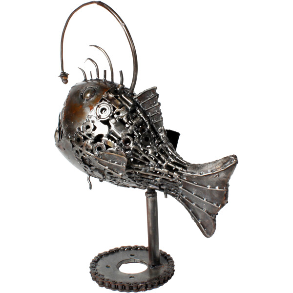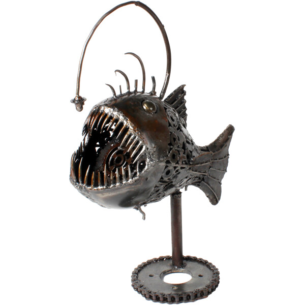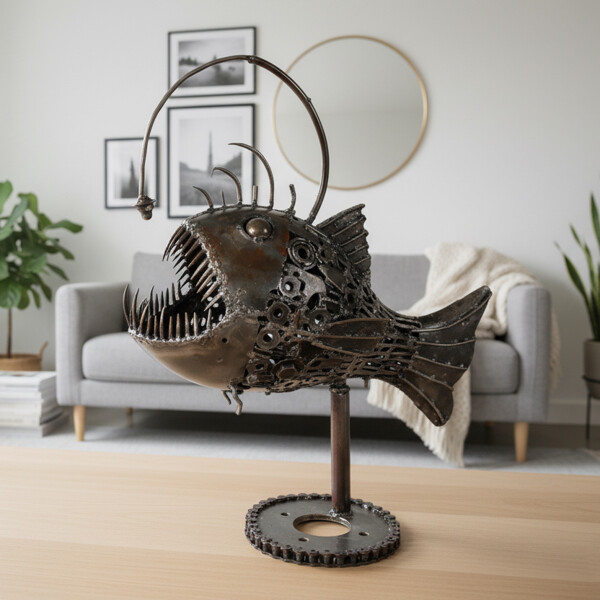 Wagen Sie es, anders zu sein, mit dieser unglaublichen 100% handgefertigten Ironjaw Angler Fish-Metallskulptur! Dies ist nicht nur eine ausgefallene Dekoration; es ist ein echtes Kunstwerk, sorgfältig aus recyceltem Metall gefertigt, was es zu einer nachhaltigen und absolut faszinierenden Ergänzung für jedes Zuhause, Büro oder kreativen Raum macht. Unsere geschickten Handwerker haben recycelte Materialien in eine fesselnde und fantasievolle Darstellung des mysteriösen Anglerfisches verwandelt. Jeder Stachel, jeder Zahn und sein ikonischer Köder sind skulptiert, was eine wirklich einzigartige Skulptur schafft, die industrielles Design mit den Wundern der Tiefsee kombiniert. Die robuste, von Zahnrädern inspirierte Basis garantiert Stabilität und trägt zu ihrem unverwechselbaren Charme bei. Maße: Ungefähr 25 x 30 x 30 cm Umweltfreundlich 100% Handgefertigt Recyceltes Metall