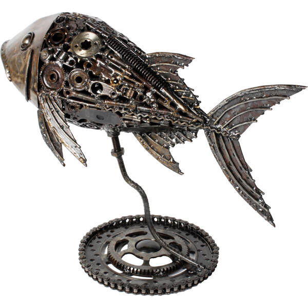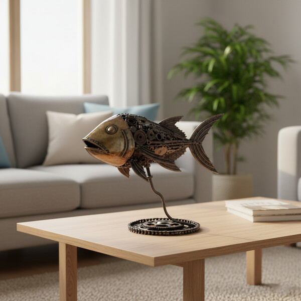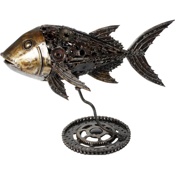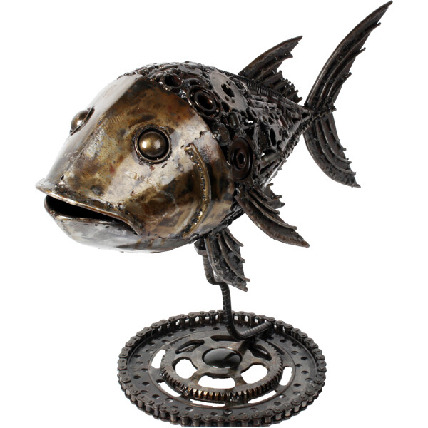 Verleihen Sie Ihrem Raum einen einzigartigen maritimen Charme mit dieser unglaublichen, zu 100 % handgefertigten Jack-Fish-Metallskulptur! Dies ist nicht nur ein dekoratives Stück; es ist ein wahres Kunstwerk, sorgfältig aus recyceltem Metall gefertigt, was es zu einer nachhaltigen und faszinierenden Ergänzung für jedes Zuhause oder Büro macht. Unsere geschickten Handwerker haben recycelte Materialien in eine fesselnde und detaillierte Darstellung des vielseitigen Jack Fish verwandelt. Jedes Zahnrad, jede Schraube und jede Metallkomponente ist durchdacht, wodurch eine einzigartige Skulptur entsteht, die die künstlerischen Möglichkeiten von recyceltem Material zeigt. Die robuste, industriell inspirierte Basis ergänzt den Fisch perfekt und verleiht Stabilität und einen Hauch von roher Eleganz. Maße: ca. 20 x 35 x 25 cm Umweltfreundlich 100% Handgefertigt Recyceltes Metall