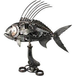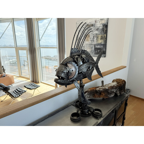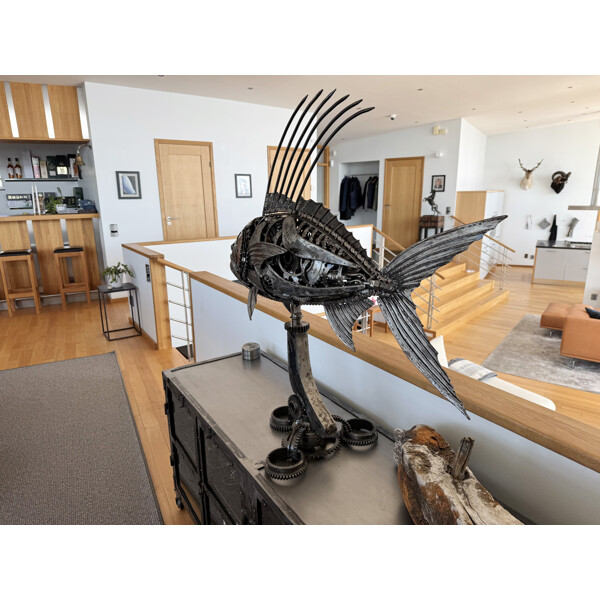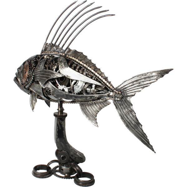 Dekorieren Sie Ihr Zuhause oder Büro mit der beeindruckenden Schönheit des Meeres durch diese unglaubliche, zu 100 % handgefertigte Hahnfisch-Metallskulptur! Dies ist nicht nur eine Dekoration; es ist ein einzigartiges Kunstwerk, sorgfältig aus recyceltem Metall gefertigt, was es zu einer nachhaltigen und fantastischen Ergänzung für jeden Raum macht. Unsere talentierten Handwerker haben recycelte Materialien in eine faszinierende und detaillierte Darstellung des markanten Hahnfisches verwandelt, der für seine prächtige Rückenflosse bekannt ist. Jedes Zahnrad, jede Kurve und jede Komponente ist sorgfältig platziert, um eine wirklich einzigartige Skulptur zu schaffen, die die einzigartige Eleganz dieses Fisches hervorhebt.