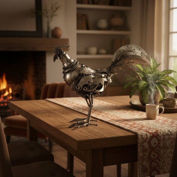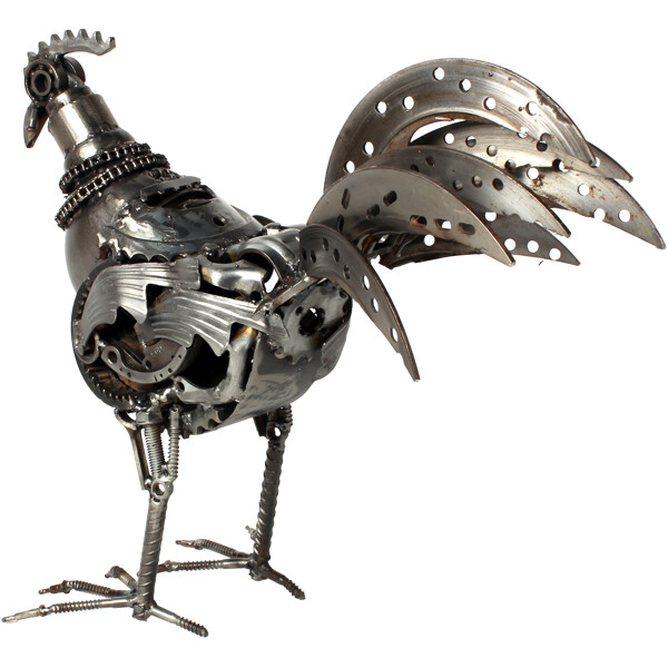 Unsere geschickten Handwerker haben recycelte Materialien umgewandelt und auf clevere Weise Zahnräder, Ketten und verschiedene Metallteile integriert, um eine prächtige und detaillierte Darstellung eines stolzen Hahns zu schaffen. Jede Feder in seinem beeindruckenden Schwanz, seine starke Haltung und sein majestätischer Kamm sind sorgfältig integriert, was eine wirklich einzigartige Skulptur schafft, die industrielle Ästhetik mit lebendigem Bauernhof-Charme verbindet.