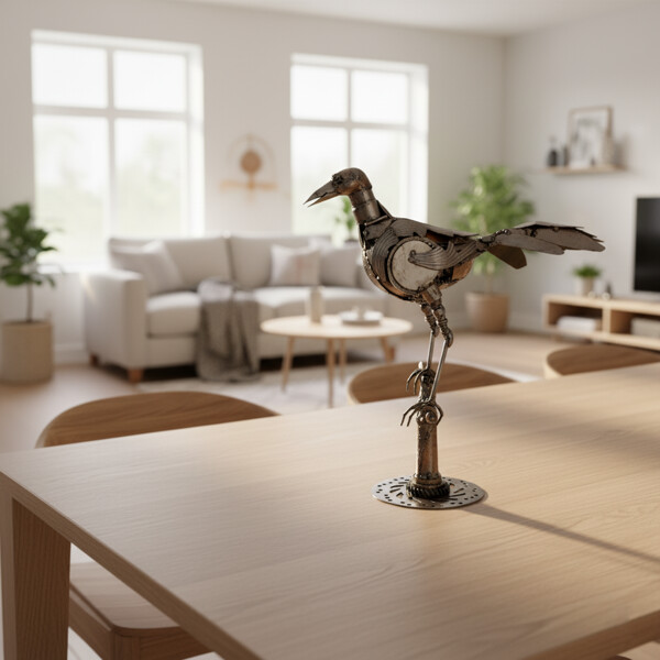 Bringen Sie einen Hauch von geheimnisvollem Charme und künstlerischer Brillanz in Ihr Zuhause mit dieser unglaublichen, zu 100 % handgefertigten Krähen-Skulptur aus Metall! Dies ist nicht nur eine Dekoration; es ist ein echtes Kunstwerk, sorgfältig aus recyceltem Metall gefertigt, was es zu einer nachhaltigen und absolut faszinierenden Ergänzung für jedes Zuhause, Büro oder Arbeitszimmer macht.