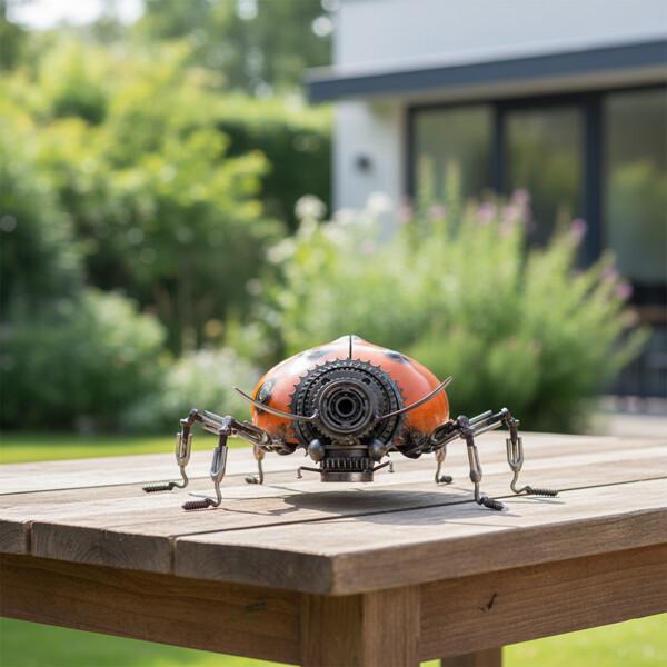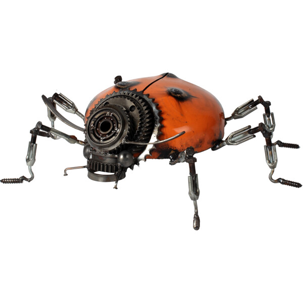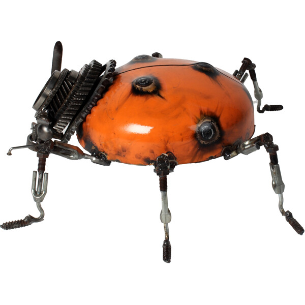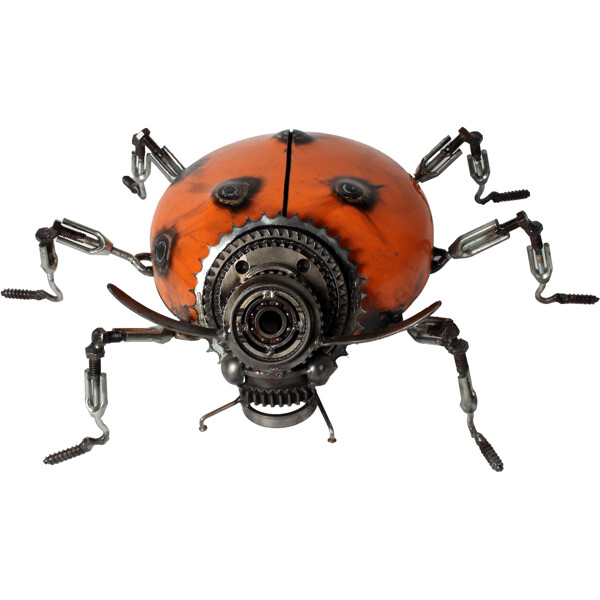 Unsere geschickten Handwerker haben recyceltes Material umgewandelt – beachten Sie den lebhaften orangefarbenen Panzer, der mit dem metallischen Kopf und den Beinen aus verschiedenen mechanischen Komponenten kontrastiert. Jedes Detail, von den charakteristischen Punkten bis zu den Antennen und den mehrgliedrigen Beinen, schafft eine wirklich einzigartige Skulptur, die robuste industrielle Ästhetik mit der geliebten Form dieses glücksbringenden Insekts kombiniert.