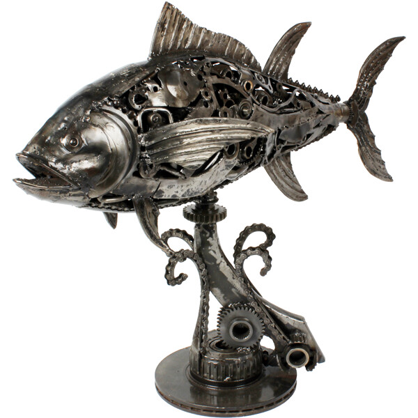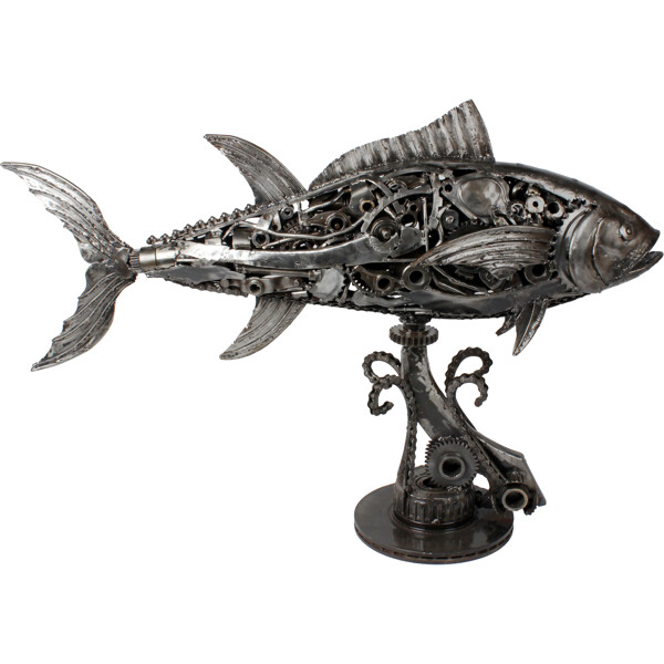 Bringen Sie die dynamische Energie des Meeres in Ihren Raum mit dieser unglaublichen, zu 100 % handgefertigten Metallskulptur eines Thunfischs! Dies ist nicht nur ein dekoratives Objekt; es ist ein einzigartiges Kunstwerk, sorgfältig aus recyceltem Metall gefertigt, was es zu einer nachhaltigen und beeindruckenden Ergänzung für jedes Zuhause oder Büro macht.