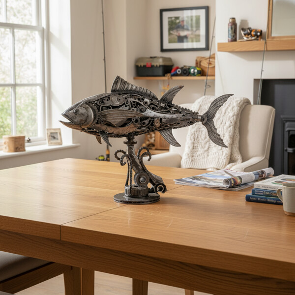 Unsere geschickten Handwerker haben recycelte Materialien in eine kraftvolle und detaillierte Darstellung des mächtigen Thunfischs verwandelt. Jede Komponente, von den komplizierten Zahnrädern bis zu den eleganten Linien seines Körpers, ist durchdacht platziert, wodurch eine wirklich einzigartige Skulptur entsteht, die das Wesen dieses schnellen Fisches einfängt.