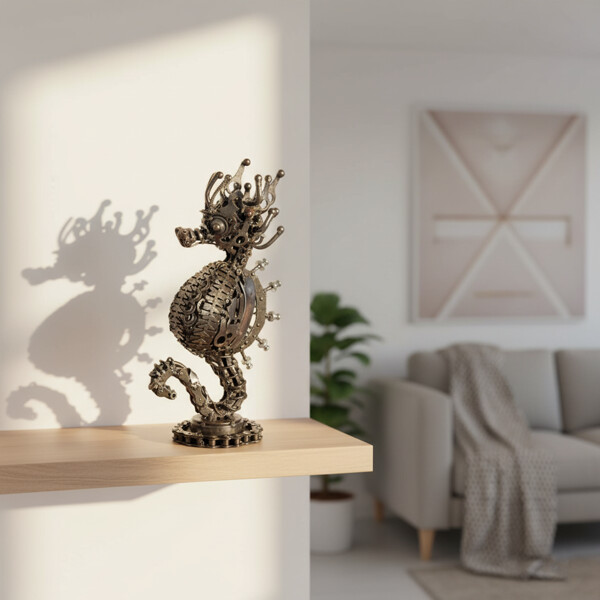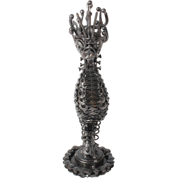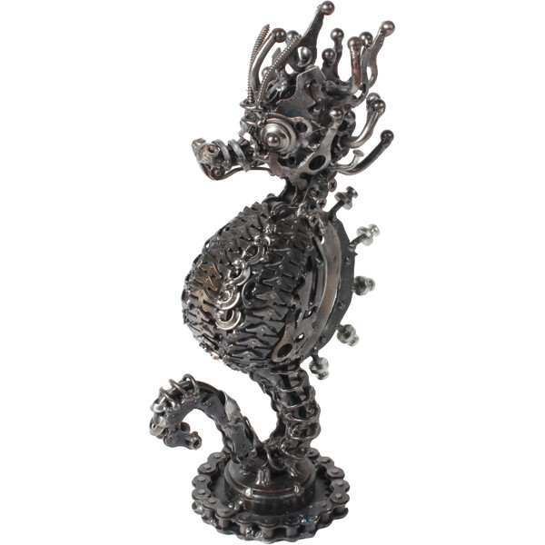 Entdecken Sie ein wirklich fesselndes Werk, das zeitlose thailändische Kunstfertigkeit mit zeitgenössischem nachhaltigem Design vereint. Wir präsentieren unser exquisites 100% handgefertigtes thailändisches Kanok-Seepferdchen aus Metall! Dies ist nicht nur ein dekoratives Objekt; es ist ein einzigartiges Kunstwerk, sorgfältig aus recyceltem Metall gefertigt, was es zu einer umweltbewussten und völlig bezaubernden Ergänzung für jeden Ort macht. Inspiriert von den komplexen und fließenden Mustern der traditionellen thailändischen Kanok-Kunst, verkörpert diese Seepferdchen-Skulptur Anmut und Stärke. Unsere geschickten Handwerker haben recycelte Materialien in eine faszinierende Darstellung verwandelt, wobei jedes Zahnrad, jede Schraube und jede Metallkomponente durchdacht integriert wurde, um ein Gefühl von Bewegung und detaillierter Eleganz zu schaffen, das an klassische thailändische Motive erinnert.