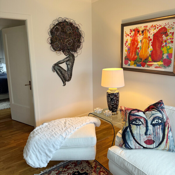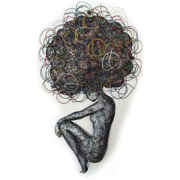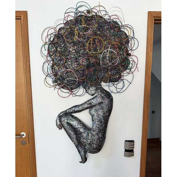 Machen Sie eine kraftvolle künstlerische Aussage in Ihrem Zuhause mit dieser prächtigen handgefertigten Metallwandkunst. Sorgfältig aus Metall geformt, zeigt dieses einzigartige Stück eine abstrakte feminine Figur mit einer dynamischen, voluminösen Form, die aus ineinander verschlungenen Metallschlaufen besteht und außergewöhnliche Kunstfertigkeit sowie eine fesselnde visuelle Textur demonstriert. 100% handgefertigt, ist es ein Beweis für echtes Handwerk und Kreativität, perfekt, um einen auffälligen Blickfang an jeder großen Wand zu schaffen. Größe: Ca. 125 x 70 x 25 cm Material: 100% Metall, geschickt geformt und gestaltet. Handgefertigte Perfektion: Jedes Stück ist vollständig handgefertigt und spiegelt eine komplexe Kunstfertigkeit und einen einzigartigen Charakter wider. Einzigartiges Design: Präsentiert eine kühne, abstrakte feminine Figur mit einem komplexen, texturierten afro- oder wolkenähnlichen Kopf aus ineinander verschlungenen Metallschlaufen, die einen multidimensionalen Effekt erzeugen.