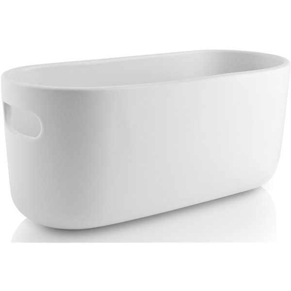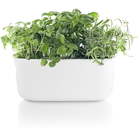 Selbstbewässerungstopf von Eva Solo. Haben Sie einen eigenen Kräutergarten in der Küche und lassen Sie ihn sich selbst versorgen. Der Herb Organiser verfügt über ein selbstbewässerndes System, das dafür sorgt, dass die Kräuter mehrere Tage lang nicht gegossen werden müssen. Er bietet den Kräutern die besten Voraussetzungen zum Wachsen, da sie in einem selbstbewässernden Blumenkasten stehen, der das Wasser aus dem Reservoir am Boden des Keramiktopfes zu den Pflanzen transportiert. Der Wasserbehälter fasst bis zu 0,5 Liter Wasser, sodass es nur erforderlich ist, regelmäßig Wasser nachzufüllen, den Rest erledigt das System selbst. Der Herb Organiser hat praktische Griffe an beiden Enden und ist daher leicht zu bewegen. Er bietet Platz für bis zu drei normal große Kräuterpflanzen in ihren eigenen Plastiktöpfen. Alle Teile außer dem Blumenkasten sind spülmaschinenfest.
