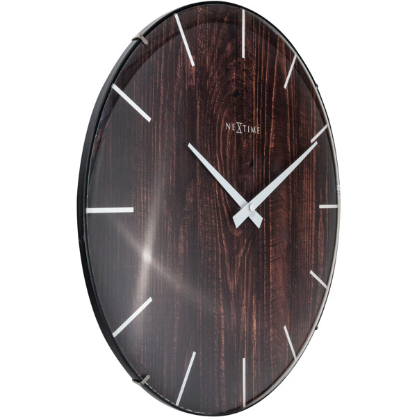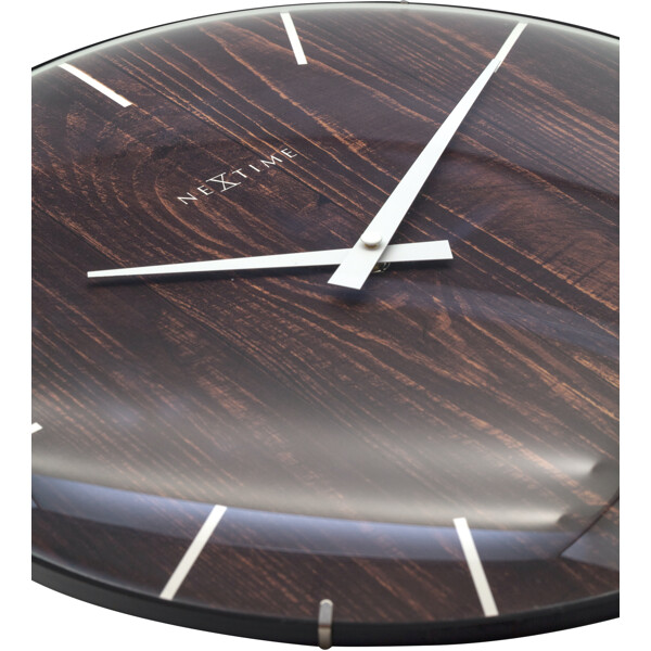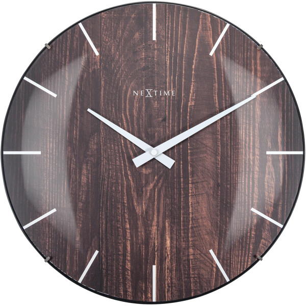 NeXtime "Edge Wood Dome" Wanduhr (Ø35cm) hat ein Zifferblatt mit Holzoptik und einem Strichindex. Das kuppelförmige Glas verleiht der natürlichen Holzoptik einen Hauch von Eleganz. Diese Uhr ist leise und wird mit 1 AA-Batterie betrieben (nicht im Lieferumfang enthalten).