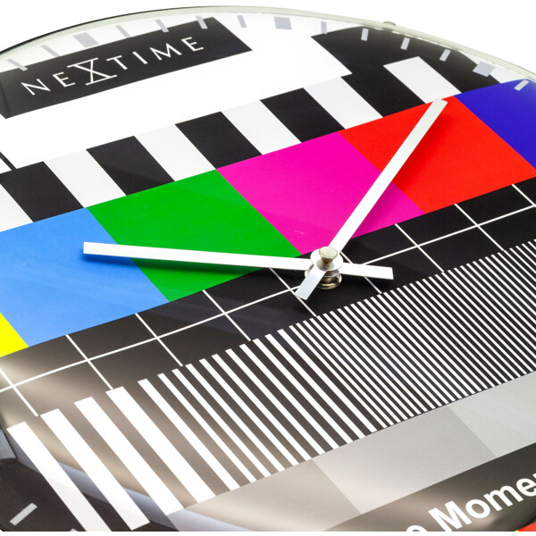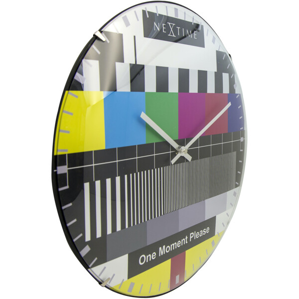 Klassische Wanduhr von NeXtime mit dem weltbekannten "Testbild" aus dem Fernsehen als Motiv auf dem Zifferblatt. Die Uhr ist mit einem kuppelförmigen Glas bedeckt, das der gesamten Uhr einen lebendigen Ausdruck verleiht. Design von Frits Vink.