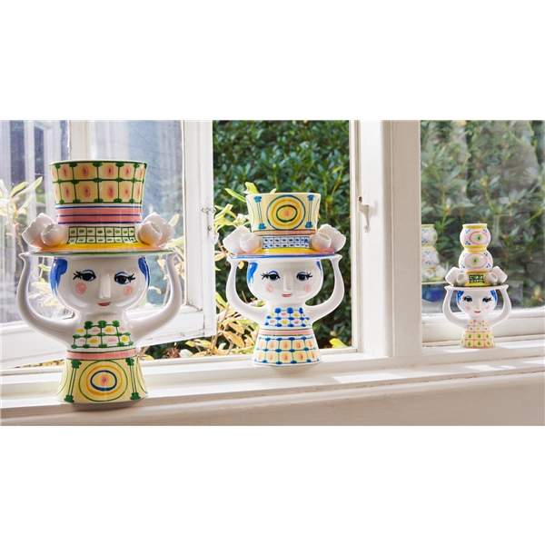 Laden Sie unsere neue Hutdame ein und lassen Sie sie mit ihren schönen Farben, raffinierten Details und handgemalten Dekorationen Freude ins Haus bringen. Bjørn Wiinblad hatte eine Vorliebe für Figuren mit Hüten, und in den Archiven gibt es unzählige Beispiele dafür, wie der Hut immer wieder auf neue, kreative und verspielte Weise auftaucht. Natürlich entwarf er keine kleinen, feinen Zierhüte. Nein, es waren große, voluminöse Kreationen, die sowohl skulptural als auch avantgardistisch in ihrem Ausdruck waren – wie in der Serie Lady with hat. Die Vase aus glasiertem Keramik mit einer Höhe von 24,5 cm zeichnet sich durch ihre grüne Farbe aus, und die geometrischen Kreise des Rocks stehen in schönem Kontrast zu den Karos des Hutes. Wie ein kleiner Turm wächst der Hut in den Himmel, während die feine Dame ihn mit den Händen balanciert. Dies verleiht der Vase einen raffinierten und fantasievollen Ausdruck, der perfekt zum Blumenstrauß in der verspielten Inneneinrichtung passt. Ein weiteres Detail, das in der Serie wiederkehrt, sind die kleinen figürlichen Blumen, die entlang der Krempe der Hüte platziert sind. Noch ein dekoratives Detail, inspiriert von Bjørn Wiinblads ursprünglichen Formen und Farben. Genau wie Bjørn Wiinblad repräsentiert Lady with hat alles, was verrückt, schräg, kreativ und wunderbar ist.