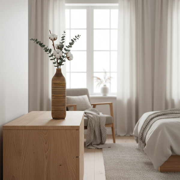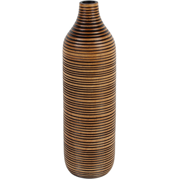 Erneuern Sie Ihre Inneneinrichtung mit der natürlichen Eleganz und dem handwerklichen Charme dieser wunderschön handgefertigten dekorativen Holzvase. Sorgfältig in Thailand hergestellt, präsentiert sie ein markantes gestreiftes Muster in natürlichen Holztönen mit kontrastierenden dunkleren Linien, die jedem Raum Wärme und modernen Stil verleihen. Diese umweltfreundliche Vase ist ein echtes Kunsthandwerk, perfekt, um nachhaltige Kunst in Ihr Zuhause zu bringen. Erhältlich in verschiedenen Größen.