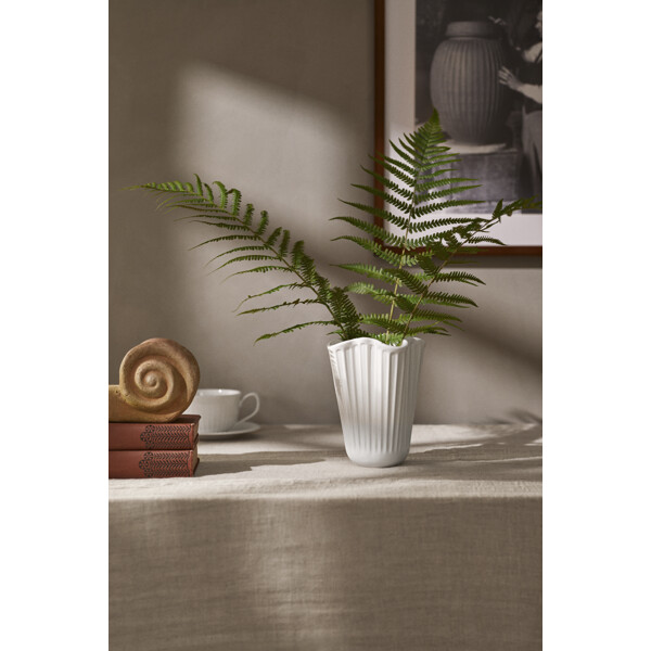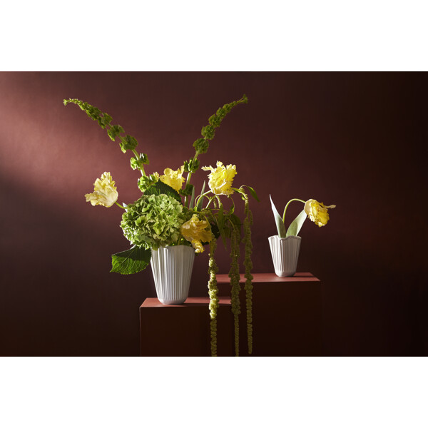 Gute Handwerkskunst und originales dänisches Design, entwickelt in einem neuen und modernen Ausdruck als schöne und stilvolle Hommage an das 10-jährige Jubiläum der Hammershøi-Serie. Mit der Hammershøi Unfold-Vasenserie kommen Sie Kählers gleichzeitig authentischem und modernem Ausdruck wieder nahe. Das Besondere an den Hammershøi Unfold-Vasen ist ihre gefaltete Form in einem weichen und einladenden Design, das Blumen dazu ermutigt, auf eine einzigartig schöne Weise zu fallen, mehr zu den Seiten der Vase geneigt. Dies verlängert die Blumen optisch nach oben durch die Form der Vase, während es die Blumen unterstützt, natürlich zu stehen. Die Hammershøi Unfold-Vasen sind aus klassischer kreideweißer Keramik gefertigt und in zwei verschiedenen Größen erhältlich. Diese große Hammershøi Unfold-Vase misst 20,5 cm in der Höhe, und zusammen mit der etwas kleineren Vase von 16,5 cm erhalten Sie das perfekte Paar für Frühlings- und Sommersträuße und abgeschnittene Zweige. Beide Vasen haben die gleiche einzigartige gefaltete Form, die der Serie ihren unverwechselbaren sowohl modernen als auch nostalgischen Touch verleiht, der zusammen mit den ikonischen Rillen Fäden zurück zu Kählers stolzen Handwerkstraditionen zieht – während sie selbstbewusst nach vorne mit Tiefe und Leben weisen. Hammershøi Unfold, ebenso wie der Rest der Hammershøi-Serie, wurde von dem Designer Hans-Christian Bauer geschaffen, inspiriert von einer der klassischen Vasen von Svend Hammershøi aus den 1930er Jahren. Mit ihrem charakteristischen organischen und verspielten Design erlaubt sie Ihnen, Ihre Blumen einfach und natürlich zu experimentieren und zu stylen. Der weiche Ausdruck in Hammershøi Unfold steht in starkem Kontrast zur klassischen Hammershøi-Vase, aber das geschulte Designauge wird sofort die enorme Ähnlichkeit und das sehr vertraute Gefühl in Form der Rillen der Vase, des Materials und der starken Präsenz bemerken. Mit Hammershøi Unfold erhalten Sie sowohl eine moderne als auch nostalgische Interpretation von Kählers handgefertigten Designtraditionen in einer modernen, zukunftsweisenden Perspektive – zwei einzigartige Kunstwerke in einem sehr speziellen Ausdruck von Tiefe und Leben, die immer der Designfaden in Kählers stolzen Handwerkstraditionen waren. In jeder Hinsicht eine wahre Hommage an 10 Jahre Vielfalt der Hammershøi-Serie.