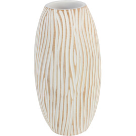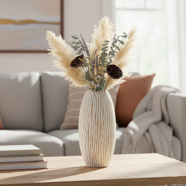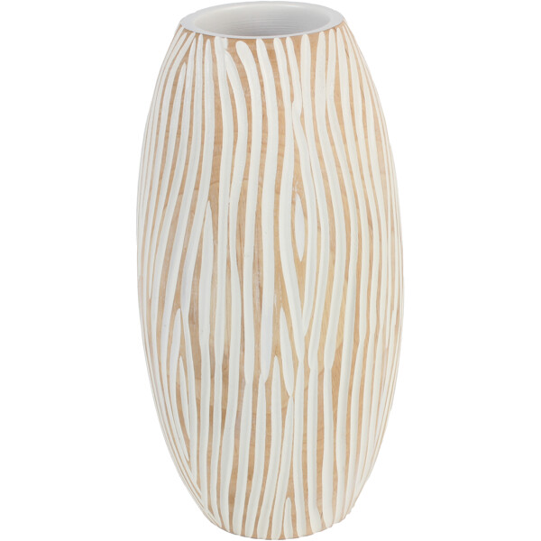 Verbessern Sie Ihr Interieur mit der organischen Schönheit und dem handwerklichen Charme dieser einzigartigen handgefertigten dekorativen Holzvase. Sorgfältig in Thailand hergestellt, verfügt sie über eine wellige vertikale geriffelte Oberfläche in Weiß, die das natürliche Holz darunter zeigt und ein fesselndes visuelles Erlebnis schafft. Diese umweltfreundliche Vase ist das Ergebnis echten Handwerks, perfekt, um Ihr Zuhause mit nachhaltiger Kunstfertigkeit und modernem Reiz zu bereichern.