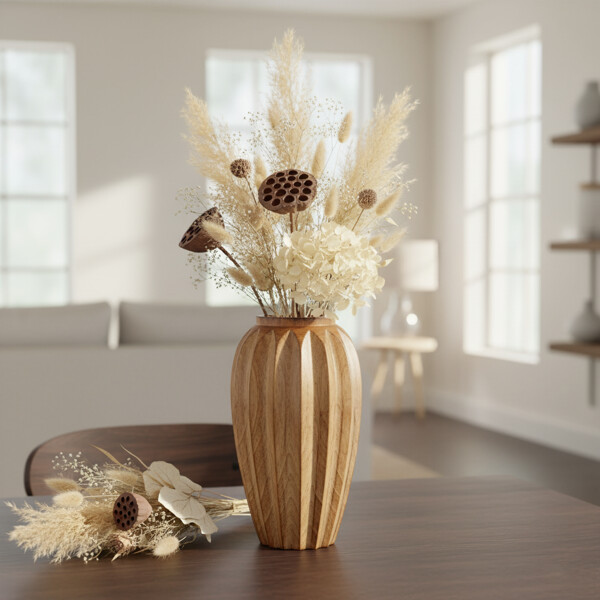Bringen Sie die Wärme natürlicher Kunstfertigkeit in Ihr Zuhause mit dieser exquisiten handgefertigten Holzvase. Sorgfältig in Thailand hergestellt, besticht sie durch ein markantes geschnitztes Design, das eleganten Blütenblättern ähnelt und die natürliche Maserung des Holzes wunderschön zur Geltung bringt. Sie verleiht jedem Raum eine Note von raffinierter organischer Struktur. Diese umweltfreundliche Vase ist das Ergebnis echten Handwerks, perfekt, um Ihr Zuhause mit nachhaltiger Schönheit und zeitlosem Charme zu bereichern.