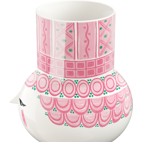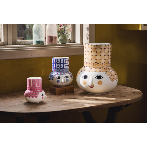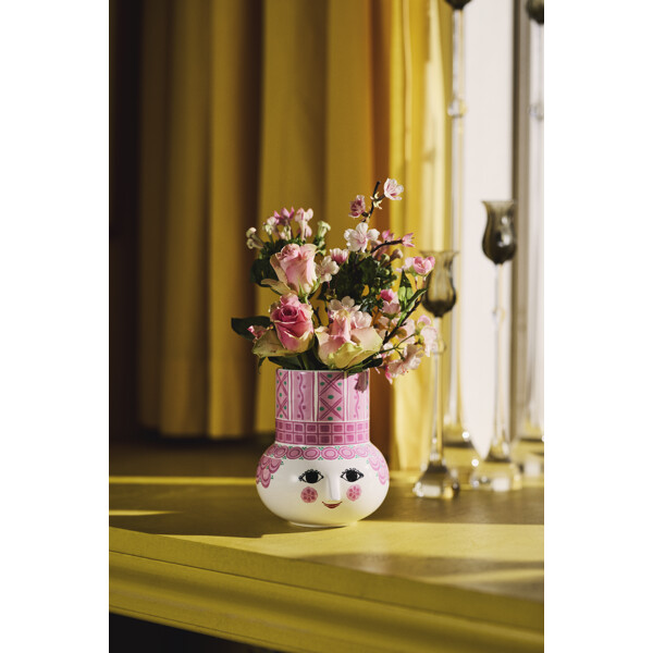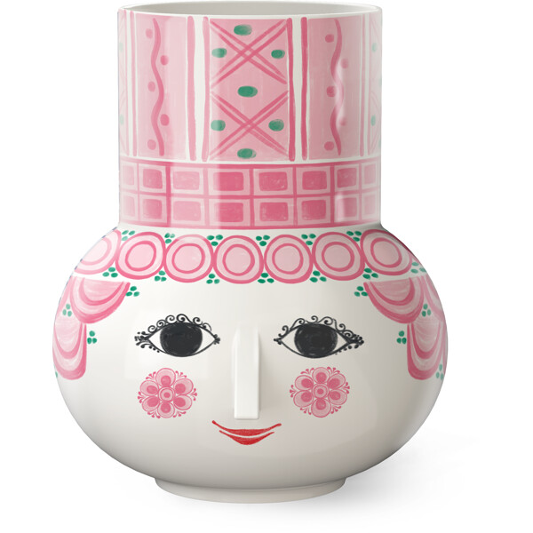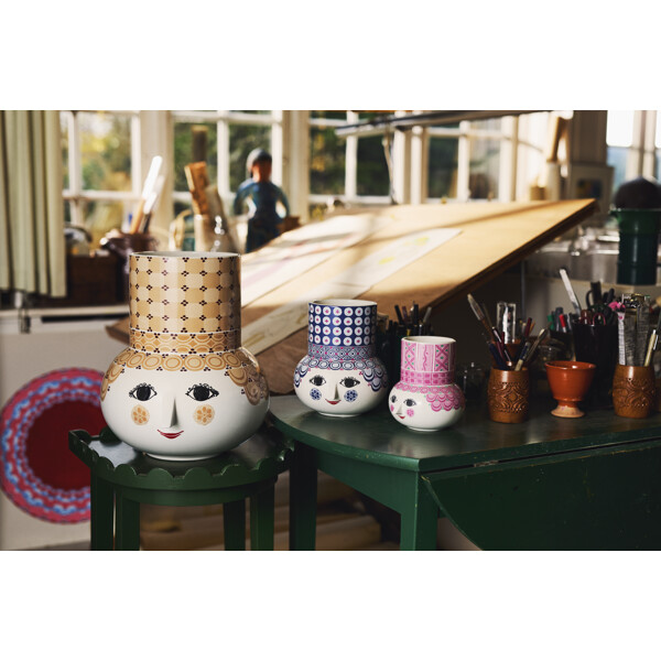 Lassen Sie Ihre farbenfrohe Persönlichkeit erstrahlen und Ihre Kreativität mit Bjørn Wiinblads Olga aufblühen. Mit ihrem strahlenden Lächeln, den errötenden Wangen und den bunten Verzierungen verkörpert Olga die Essenz von Bjørn Wiinblad als Person und Künstler – selbst wenn sie in Form einer Vase gestaltet ist. Fröhlich und verträumt verleiht sie der Einrichtung mit ihrem poetischen Ausdruck und ihren lebhaften Farben Leben und Persönlichkeit. Die Olga-Vase ist eine Neuinterpretation einer ikonischen Vase, die Bjørn Wiinblad in Zusammenarbeit mit der Keramikfabrik Nymølle schuf. Die neuen Olga-Vasen haben denselben zylindrischen oberen Teil wie die Vase aus Bjørn Wiinblads beeindruckendem Designarchiv und sind mit einem süßen runden Gesicht mit mandelförmigen Augen und der ikonischen dreieckigen Nase verziert, die fast die Personifizierung von Bjørn Wiinblads Kunst ist. Alle Olga-Vasen sind aus glänzend glasierter Keramik mit bunten Dekoren gefertigt, und die Verzierungen sind eine wunderbare Mischung aus Originalmustern von Bjørn Wiinblad, die in einer vielfältigen Farbpalette ein modernes und frisches Erscheinungsbild bieten. Bjørn Wiinblad war ein fröhlicher Künstler mit einer großen und farbenfrohen Persönlichkeit, der seinen eigenen Weg ging und keine Angst hatte, groß zu träumen und zu denken. Sein Geist ist in Olga voll und ganz spürbar, die uns auf sehr selbstbewusste Weise einlädt, unseren eigenen Stil und unsere Persönlichkeit in der Einrichtung mit farbenfrohen Blumensträußen, exotischen Pflanzen und kreativen Dekorationen auszudrücken. Eines ist sicher: Das Leben wird nie langweilig, wenn Olga einzieht.