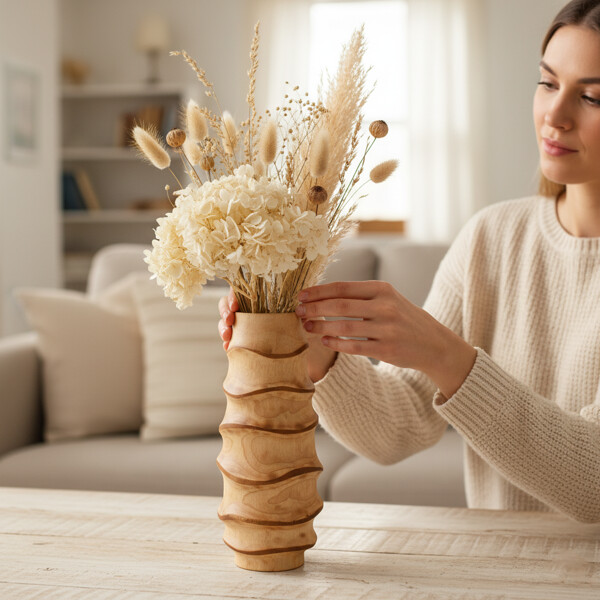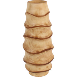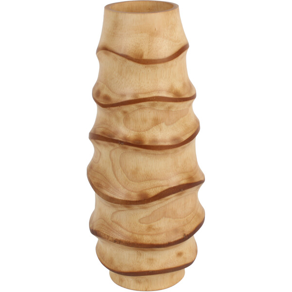 Verbessern Sie Ihre Einrichtung mit der natürlichen Schönheit und dem handwerklichen Charme dieser einzigartigen handgefertigten dekorativen Holzvase. Sorgfältig in Thailand hergestellt, verfügt sie über eine markante tief gerillte und wellige Oberfläche, die die Maserung des natürlichen Holzes wunderschön zur Geltung bringt und jedem Raum eine dynamische, organische Textur verleiht. Dieses umweltfreundliche Objekt ist das Ergebnis echter Handwerkskunst und ideal, um Ihr Zuhause mit nachhaltiger Kunst und modernem Reiz zu erneuern.