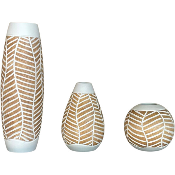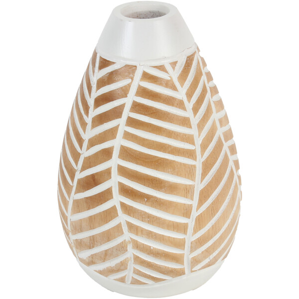 Fügen Sie Ihrer Inneneinrichtung einen Hauch von organischer Schönheit und handwerklichem Charme mit dieser handgefertigten Tropfenform-Holzvase hinzu. Sorgfältig in Thailand hergestellt, verfügt sie über ein einzigartiges weißes, blattähnliches Muster auf natürlichem Holz, ergänzt durch weiße Details oben und unten. Dieses umweltfreundliche Objekt ist ein echtes Kunsthandwerk, das nachhaltige Kunst und eine einladende Form in Ihr Zuhause bringt. Erhältlich in verschiedenen Formen.