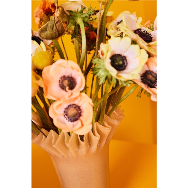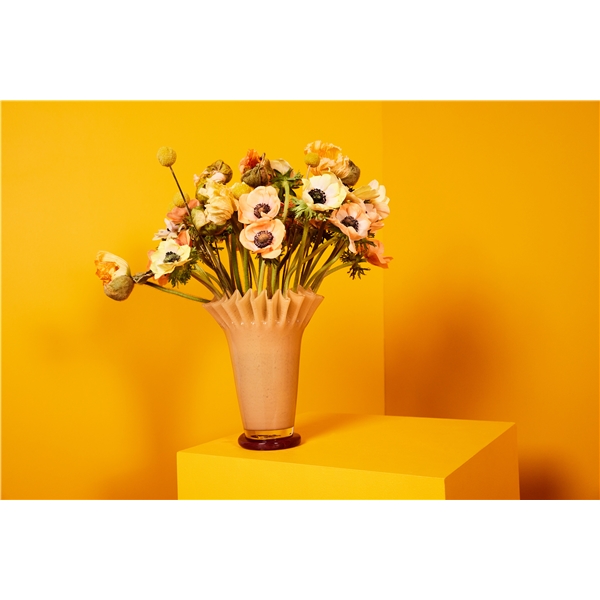 Inspiriert von den plissierten Röcken der Modewelt erinnert die Form an eine Blume, die gerade ihre Blätter entfalten will. Die glasierten Farben und der runde, niedrige Fuß im Kontrast machen Lori zu einer Kreation, die man nicht so schnell vergisst. Lori wirkt wie Glaskunst oder wie freche Bonbons in glänzendem Karamellpapier. Egal, wo Lori einzieht, sie tut es mit der gleichen Präsenz wie exklusive Trophäen. Loris Produkte sind handgefertigt, was jedes einzelne Teil einzigartig und unterschiedlich macht. Die Vase Lori ist hoch und präsentiert sich gerne ohne etwas, trägt aber auch ein paar einfache Blumenstängel wie das Schönste der Welt. Die Vase Lori ist ein Kunstwerk.