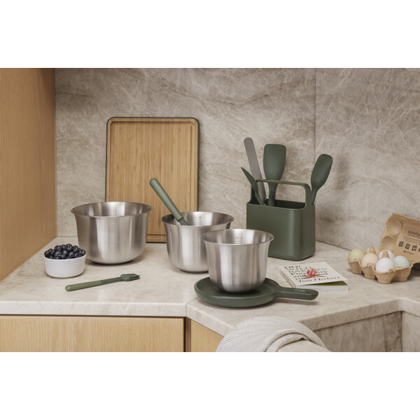 Verwenden Sie die Rührschüssel zum Mischen, Wenden, Kneten oder Aufbewahren von Lebensmitteln. Die Schüssel besteht zu 90 Prozent aus recyceltem Edelstahl aus Verbraucherabfällen, was sie langlebig und widerstandsfähig gegen Stöße, Kratzer und Dellen macht. Sie hält Handmixern, Schneebesen und anderen Metallwerkzeugen problemlos stand. Ein Gummiring am Boden sorgt dafür, dass die Schüssel fest auf der Arbeitsfläche steht. Mit ihrem abgerundeten Boden und den hohen Rändern ist die Schüssel perfekt zum Schlagen geeignet, und ihre Fähigkeit, sowohl hohen als auch niedrigen Temperaturen zu widerstehen, macht sie ideal für Wasserbäder und das Abkühlen von Zutaten. Edelstahl reagiert nicht mit sauren oder basischen Lebensmitteln, was die Schüssel optimal zur Aufbewahrung von Lebensmitteln macht. Innere Maßmarkierungen erleichtern das Abmessen von Zutaten direkt in der Schüssel, die zudem stapelbar ist, um Platz im Kühlschrank zu sparen, und spülmaschinenfest ist.