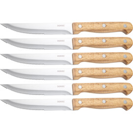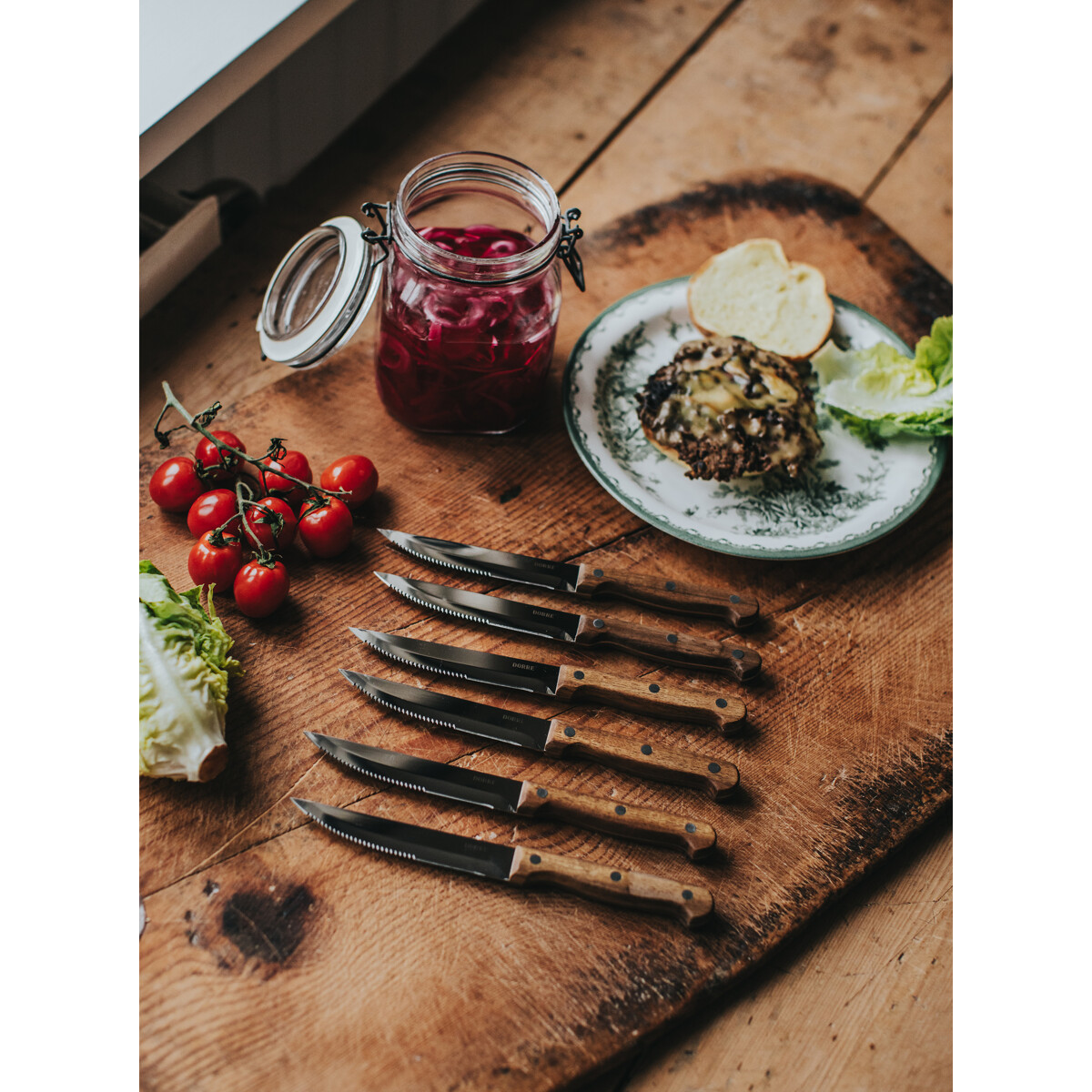 BBQ-Steakmesser im 6er-Pack werden in einer Holzkiste geliefert und haben Klingen aus rostfreiem Stahl sowie Griffe aus Akazienholz. Mit ihrer Länge liegen sie fest in der Hand und schneiden Fleisch mit Leichtigkeit. Ein rustikales und stilvolles Set, das den Grillabend aufwertet und bei jedem Schnitt ein Premiumgefühl vermittelt.