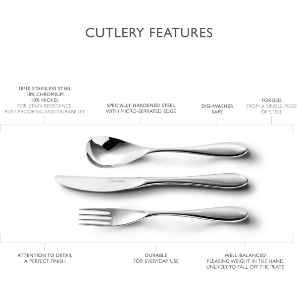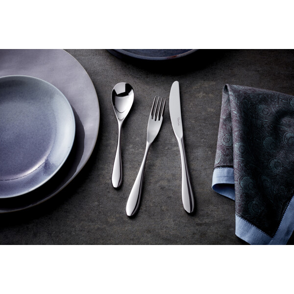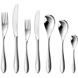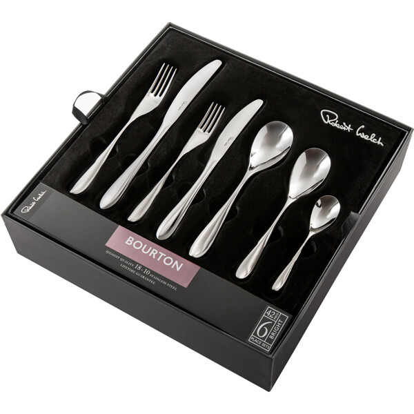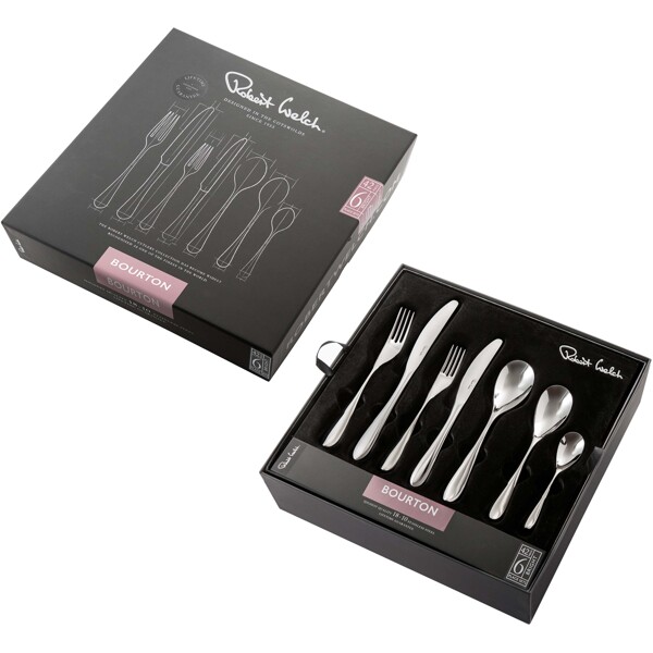 Bourton Besteckserie in 42 Teilen von Robert Welch, inspiriert vom gewundenen Fluss, der durch das malerische Dorf Bourton on the Water fließt. Mit ihrem weichen und eleganten Profil wird die Besteckserie schnell zum Favoriten. Löffel und Gabeln sind aus hochwertigem 18/10 Edelstahl gefertigt. Die Klingen der Messer bestehen aus speziell gehärtetem Edelstahl, um die bestmögliche Schneide zu gewährleisten.