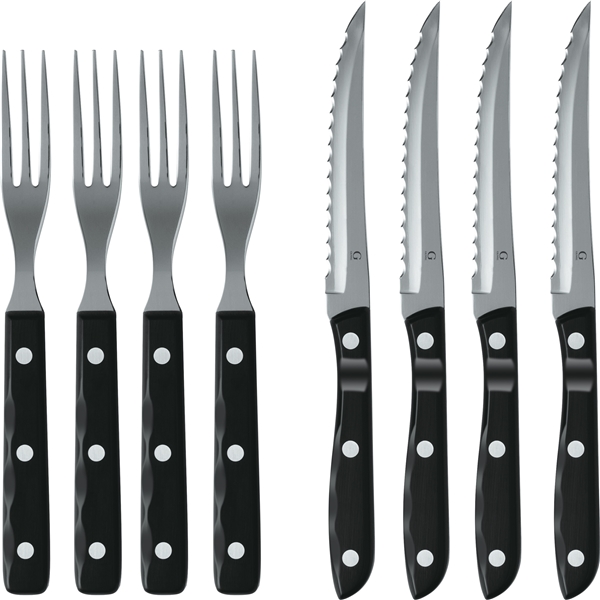 Ein beliebtes und robustes Besteck. Entworfen von Bent Severin. Material: 18/8 Edelstahl und schwarzer POM-Kunststoff. Die Klinge des Messers ist besonders geeignet für Steaks oder gegrilltes Fleisch, kann aber für alle Arten von Anlässen verwendet werden.Für schwarze Grillbestecke ist es in Ordnung, sie in der Spülmaschine bei maximal 55 Grad zu reinigen. Dieses Set enthält 4 Messer und 4 Gabeln, die in einer schönen Holzkiste verpackt sind. Die schwarzen Grillbestecke können in der Spülmaschine bei maximal 55 Grad gereinigt werden.