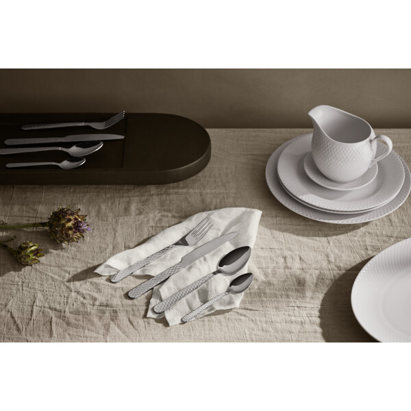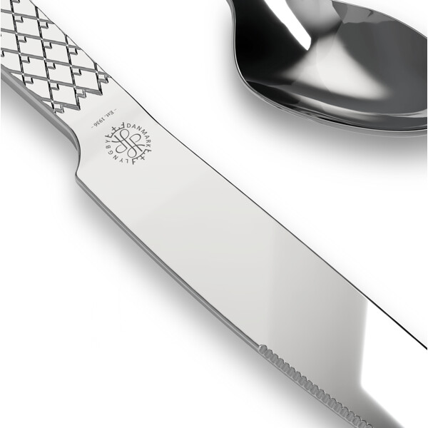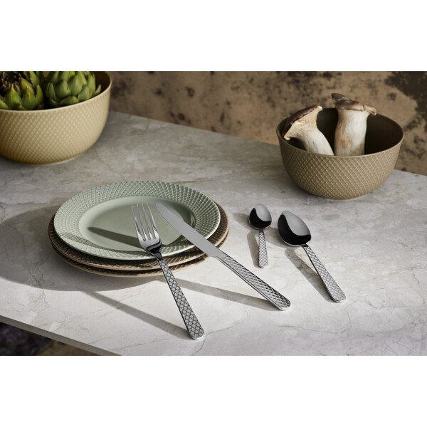 Schaffen Sie Zusammengehörigkeit in Ihrer Tischdekoration mit der ikonischen Rhombe-Signatur. Mit dem Rhombe-Besteckset von Lyngby Porcelæn können Sie nun eine einzigartige Einheit über alle Rhombe-Serien hinweg erreichen und das zusätzliche Tiefenempfinden und die Atmosphäre genießen, die ein schönes Besteckset aus 100% recyceltem Stahl mit seinen stilvollen Linien zur Perfektion hinzufügt. Jedes einzelne Besteckteil ist so gestaltet, dass es mit den Details des Porzellans harmoniert, sodass Sie die Möglichkeit haben, genau das Gefühl von Luxus zu schaffen, das jede Mahlzeit zu einem sublimen sensorischen Erlebnis macht – komponieren Sie Ihr eigenes persönliches Meisterwerk, um all die kleinen Momente zu feiern und den Alltag in etwas Besonderes zu verwandeln und jede festliche Zusammenkunft unvergesslich zu machen mit einem vollendeten Stil und Finesse. Messer, Gabel, Löffel und Teelöffel. Jeweils vier Stück. Und das bekannte grafische Rhombe-Muster ist selbstverständlich auf allen 16 Teilen des neuen Bestecks zu finden, wobei das Muster auf dem Griff liegt und als flaches Relief hervorgehoben ist, genau wie Sie es von der Serie des Tafelgeschirrs kennen. Es ist nicht nur schön und stilvoll, sondern sorgt auch für ein ausgezeichnetes taktiles Gefühl in den Händen, wenn Sie das Besteck halten. Mit dem Rhombe-Besteckset erhalten Sie ein stromlinienförmiges und exklusives Design, das Sie einlädt, das Besteck zu greifen und die Reliefs in der Hand zu spüren. Und gleichzeitig verlängert es das Rhombe-Muster schön und stilvoll auf den Tisch. Die glänzende Oberfläche aller Teile des Bestecksets verstärkt die visuelle Tiefe des Rhombe-Musters, das sofort ins Auge fällt und einen ganz einzigartigen visuellen Blickfang bietet, den Sie nur mit dem originalen Rhombe-Design erhalten können. Mit einer schönen Oberfläche und einem kleinen dezenten Logo, das in den polierten Stahl geprägt ist, passt es sowohl zum klassischen weißen Rhombe-Geschirr, zur Rhombe Earth-Kollektion als auch zu den Rhombe Color-Teilen und wird als etwas ganz Neues dazu beitragen, die vielen Porzellanteile der gesamten Rhombe-Serie mit einem neuen herrlichen und natürlichen Material zu erweitern, das das dezente Muster auf eine neue Weise hervortreten lässt – und wo der Kontrast zwischen der weichen Formensprache und dem strengen Rhombe-Relief die Formen des Musters noch deutlicher hervorhebt und den Fokus schafft.