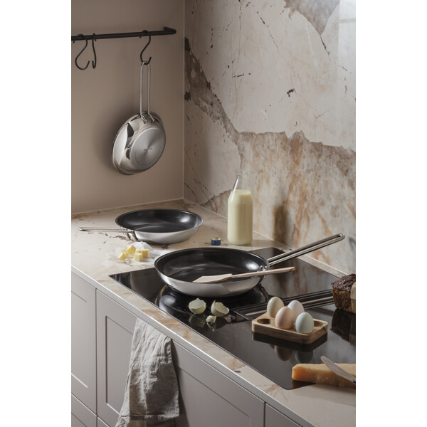 Außerdem hat sie eine Größe, die zu den meisten Herden passt. Der Korpus der Pfanne besteht zu 90 Prozent aus recyceltem Edelstahl, einem Material, das extrem langlebig und leicht sauber und ansehnlich zu halten ist. Die Innenseite der Pfanne ist mit einer keramischen Slip-Let®-Beschichtung versehen, die effektiv verhindert, dass Lebensmittel haften bleiben oder anbrennen, was das Kochen und die Reinigung erleichtert. Die Pfanne hält Temperaturen bis zu 400 °C stand, ist kratzfest und funktioniert auf allen Wärmequellen. Sie ist auch spülmaschinenfest.